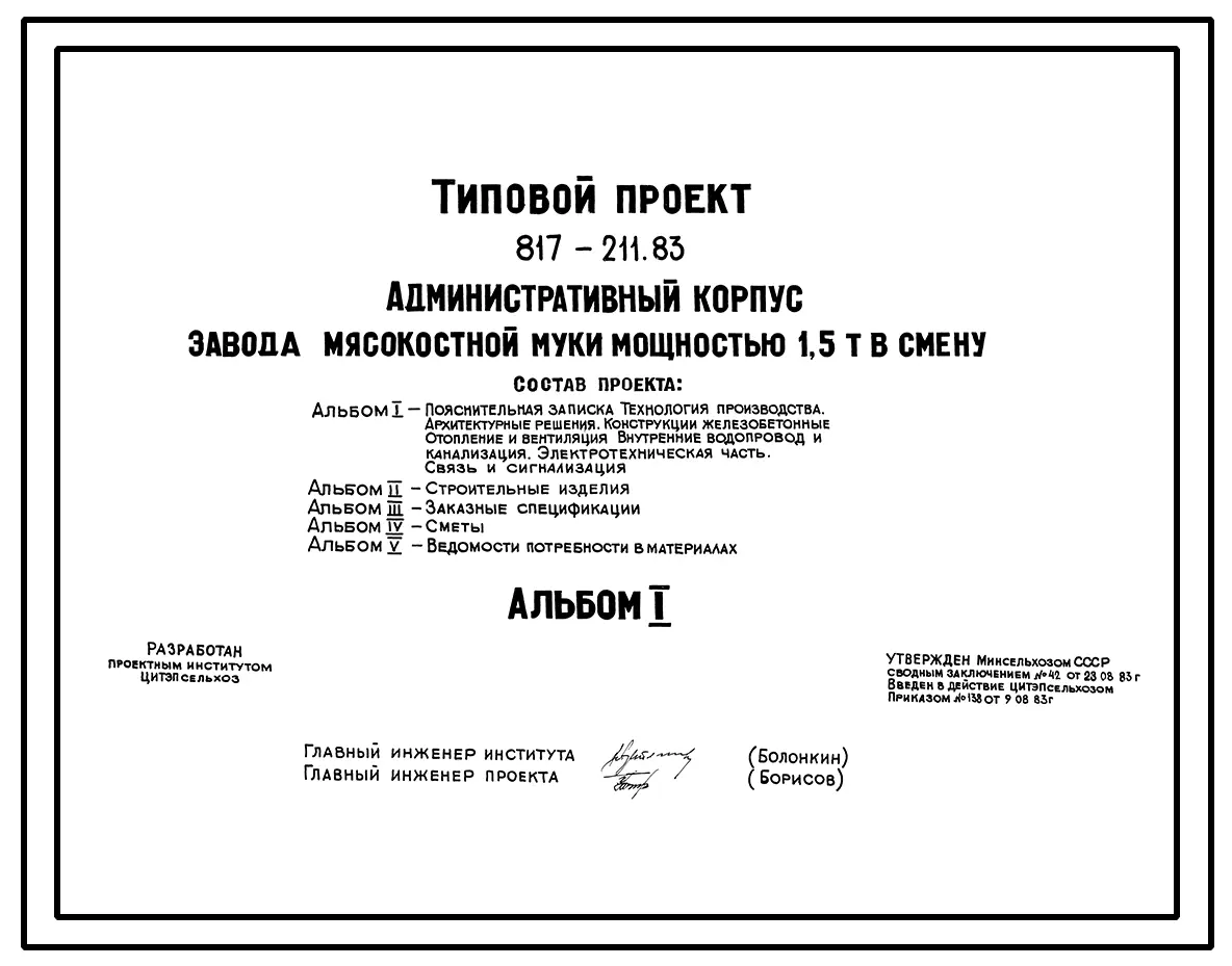 Типовой проект 817-211.83 Административный корпус завода мясокостной муки мощностью 1,5 т в смену. Размеры здания - 12x12 м. Расчетная температура: -20, -30, -40°С. Стены - панельные легкобетонные. Покрытие - железобетонные плиты по железобетонным балкам