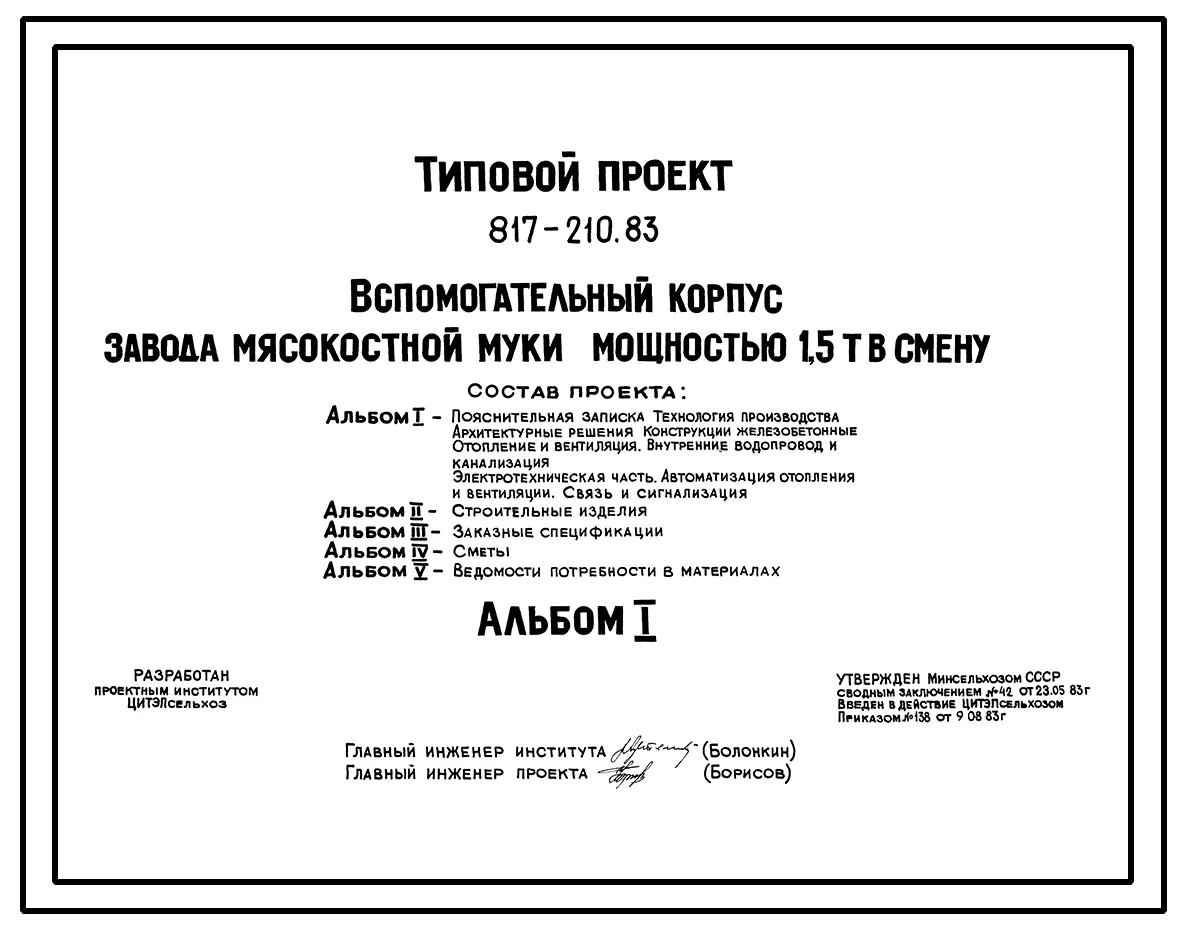 Типовой проект 817-210.83 Вспомогательный корпус завода мясокостной муки мощностью 1,5 т в смену. Размеры здания - 12x54 м. Расчетная температура: -20, -30, -40°С. Стены - панельные легкобетонные. Покрытие - железобетонные плиты по железобетонным балкам