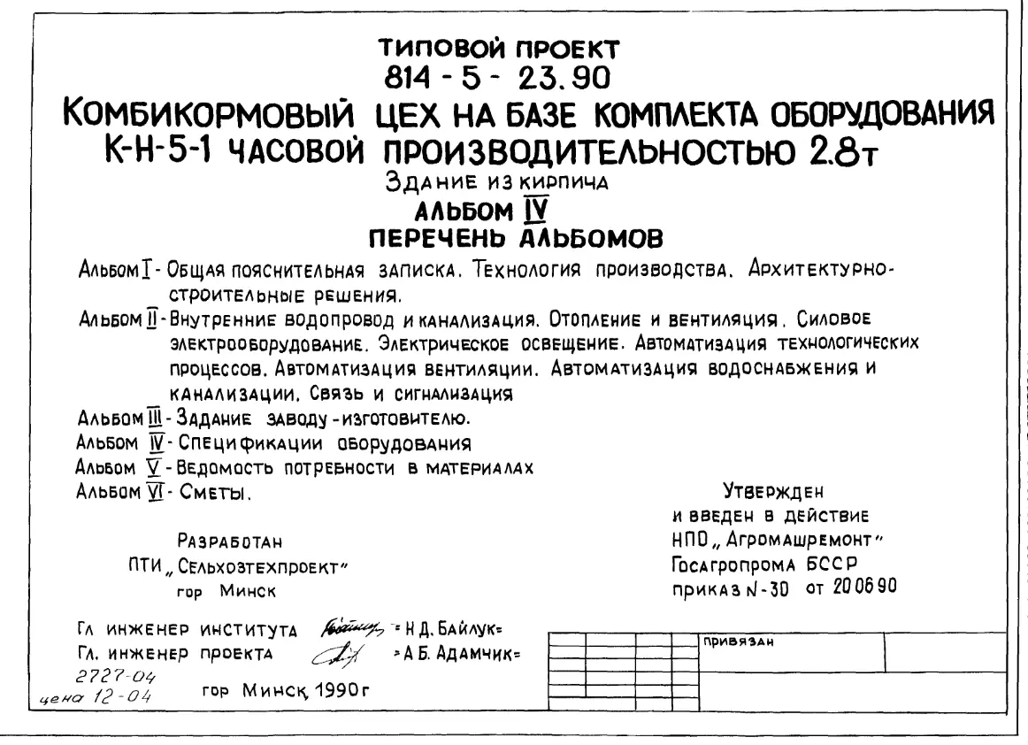Типовой проект 814-5-23.90 Комбикормовый цех на базе комплекта оборудования К-Н-5-1 часовой производительностью 2,8 т со стенами из кирпича