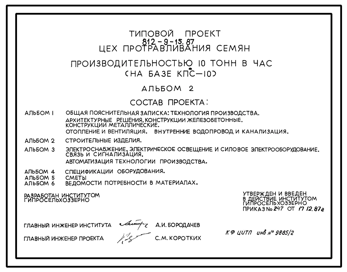 Типовой проект 812-9-15.87 Цех протравливания семян производительностью 10 т/ч (на базе КПС-10). Предназначен для приема, протравливания (с инкрустацией) и временного хранения протравленных семян зерновых, зернобобовых и масличных культур. Размер здания -