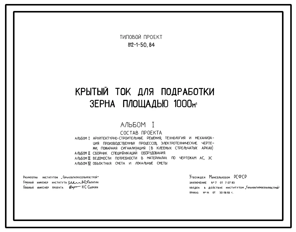 Типовой проект 812-1-50.84 Крытый ток для подработки зерна площадью 1000 м2 (в клееных стрельчатых арках). Предназначен для послеуборочной подработки на двух технологических линиях зерна озимых и яровых культур: прием, очистка, сортировка