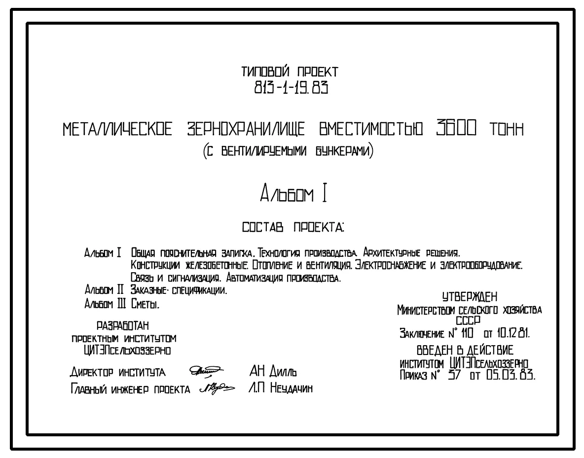 Типовой проект 813-1-19.83 Металлическое зернохранилище вместимостью 3600 т (с вентилируемыми бункерами). Предназначено для хранения семян зерновых культур продовольственно-фуражного назначения. Размеры: хранилища - 14x89,2 м; бункера - Д-6 м; диспетчерск