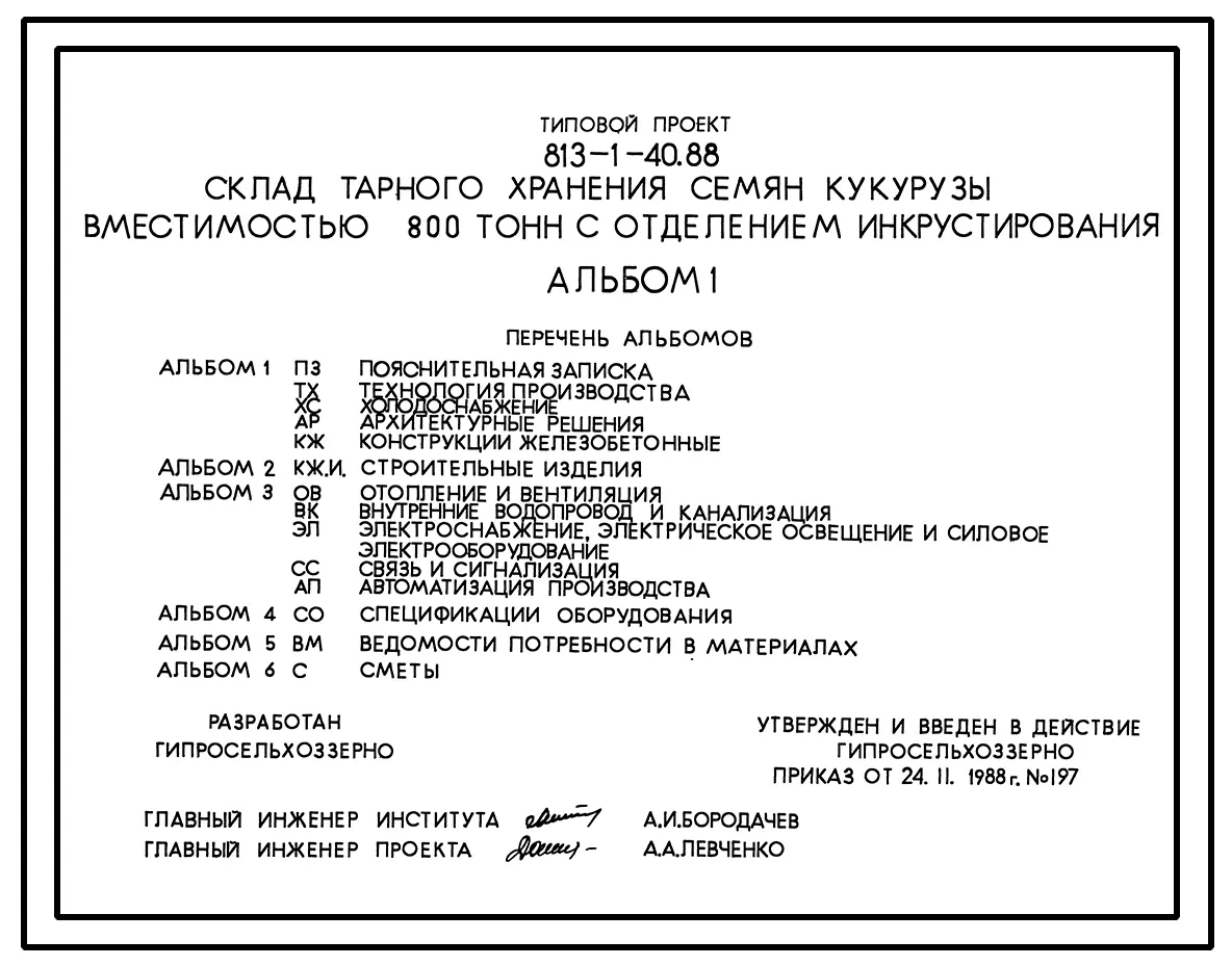 Типовой проект 813-1-40.88 Склад тарного хранения семян кукурузы вместимостью 800 т с отделением инкрустирования. Предназначен для хранения в таре инкрустированных семян кукурузы. Размеры здания - 18x66,6 м. Расчетная температура: -20, -30°С.
