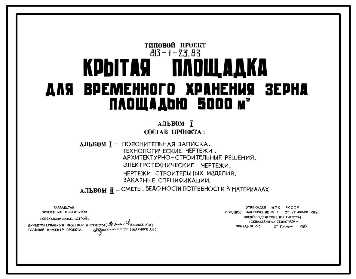 Типовой проект 813-1-23.83 Крытая площадка для временного хранения зерна площадью 5000 м2. Предназначена для выгрузки, оздоровления, временного хранения и загрузки зерна. Расчетная температура: -25°С. Покрытие - асбестоцементные листы по железобетонным ба