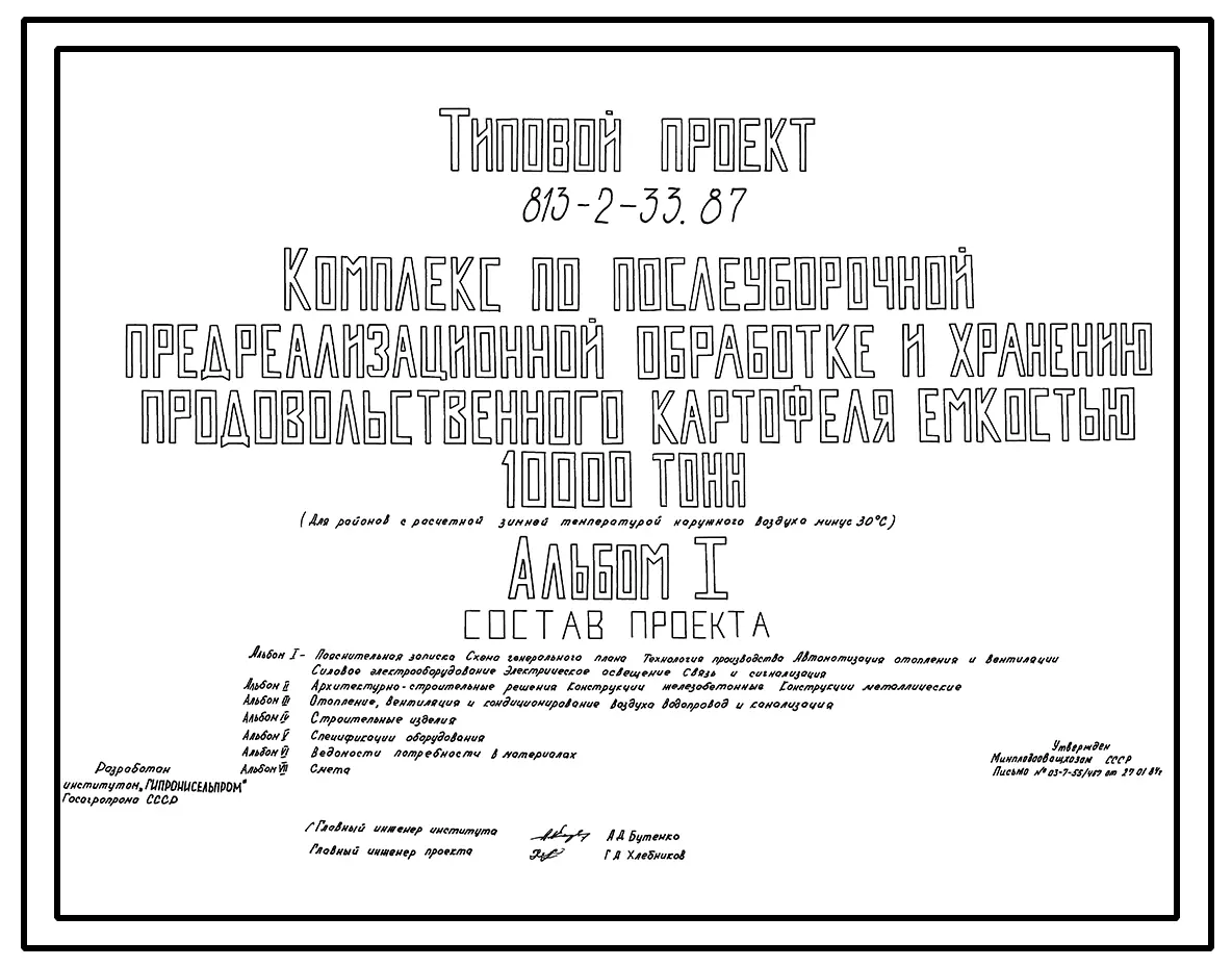 Типовой проект 813-2-33.87 Комплекс по послеуборочной, предреализационной обработке и хранению продовольственного картофеля емкостью 10000 т. Предназначен для приемки, послеуборочной обработки, хранения продовольственного картофеля в условиях активной вен
