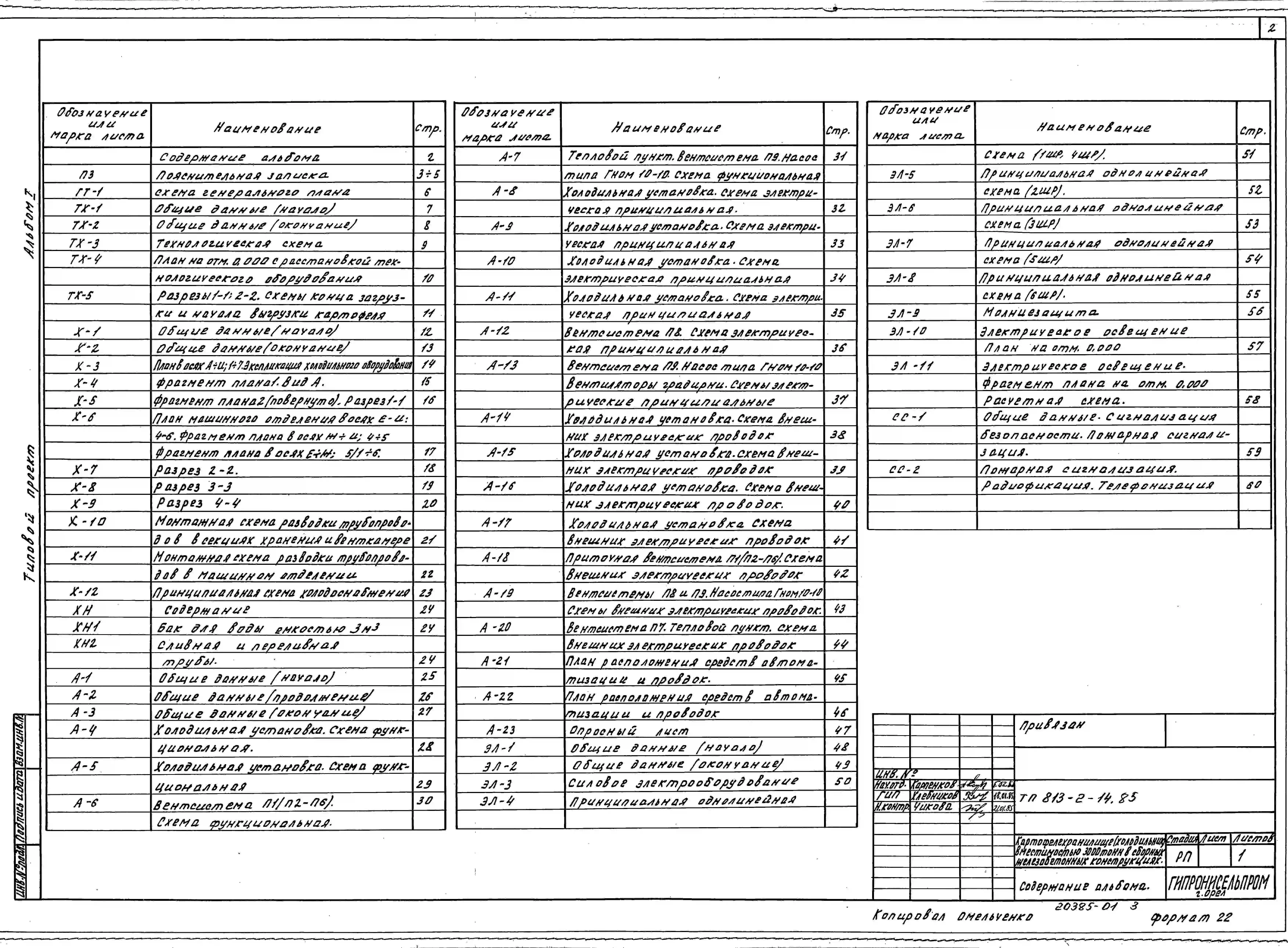 Типовой проект 813-2-14.85 Картофелехранилище (холодильник) вместимостью 3000 т единовременного хранения. Предназначено для хранения с охлаждением и предреализационной обработки продовольственного картофеля. Размеры здания - 42x60,6 м. Расчетная температу