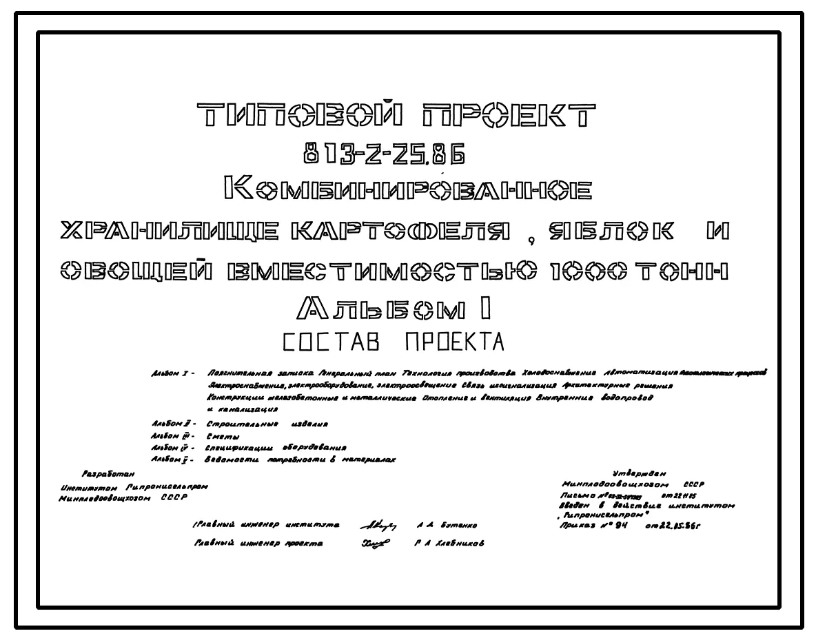 Типовой проект 813-2-25.86 Комбинированное хранилище картофеля, яблок и овощей вместимостью 1000 т. Предназначено для хранения с охлаждением и предрализационной обработки картофеля, овощей и яблок. Размеры здания - 24x48 м. Расчетная температура: -30°С.Ст