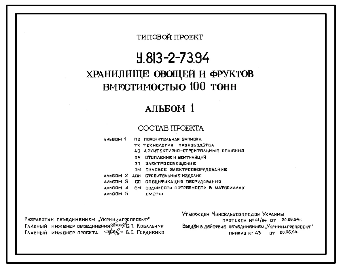 Типовой проект У.813-2-73.94 Хранилище овощей и фруктов вместимостью 100 тонн