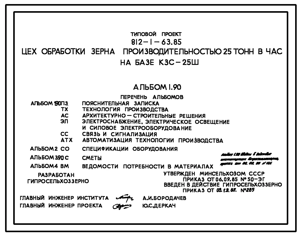 Типовой проект 812-1-63.85 Цех обработки зерна производительностью 25 т/ч на базе КЗС-25Ш
