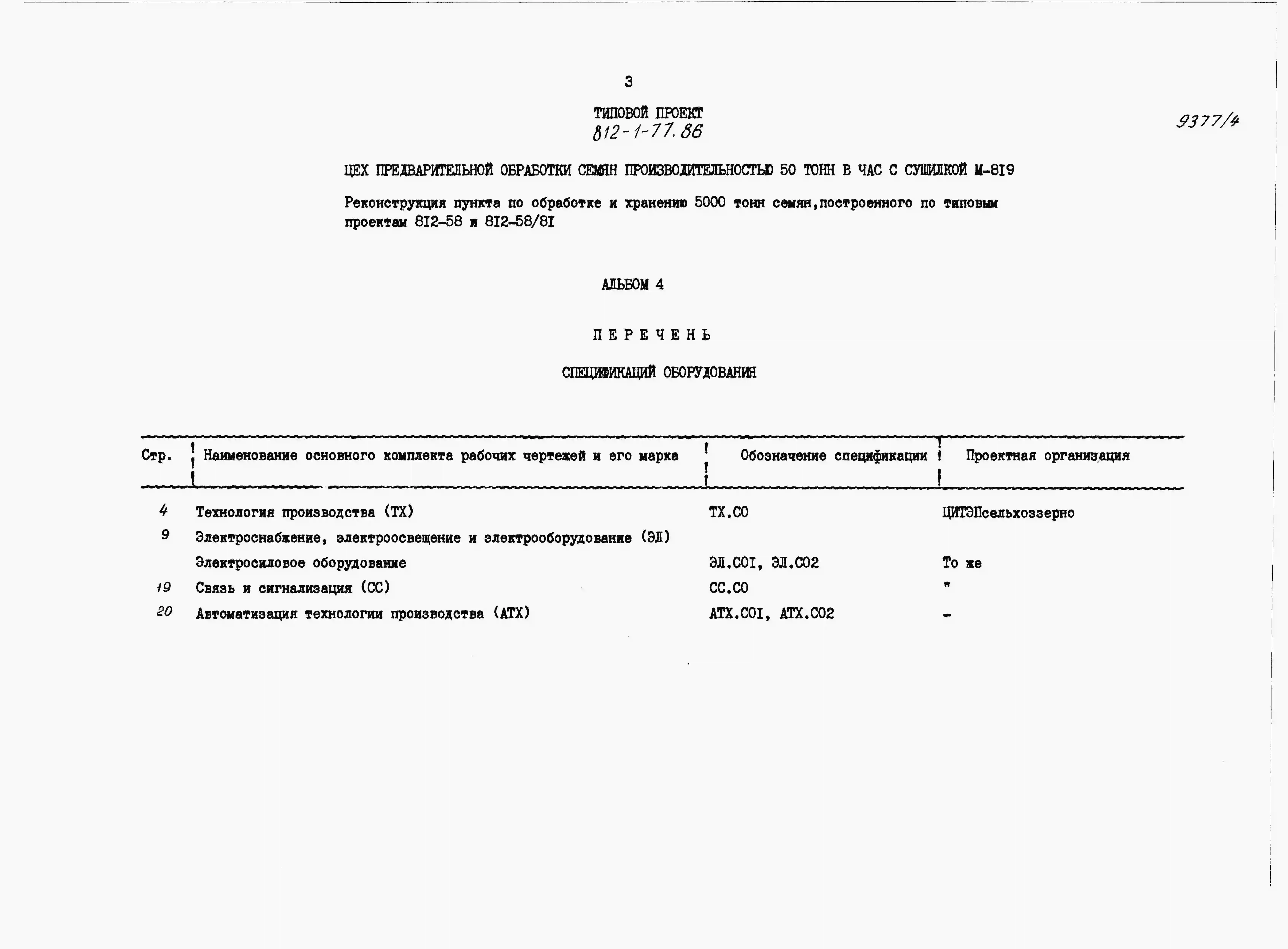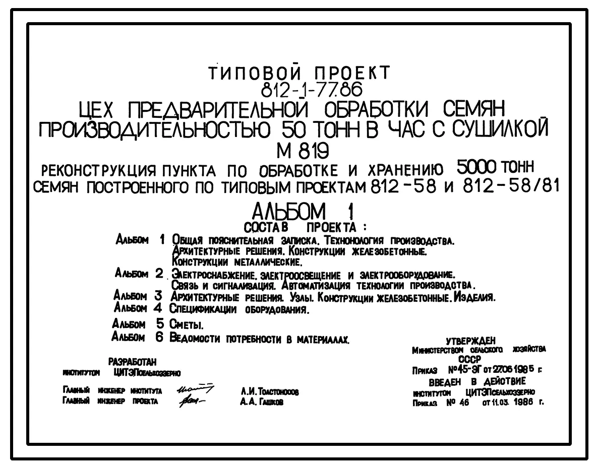 Типовой проект 812-1-77.86 Цех предварительной обработки семян производительностью 50 т/ч с сушилкой М 819