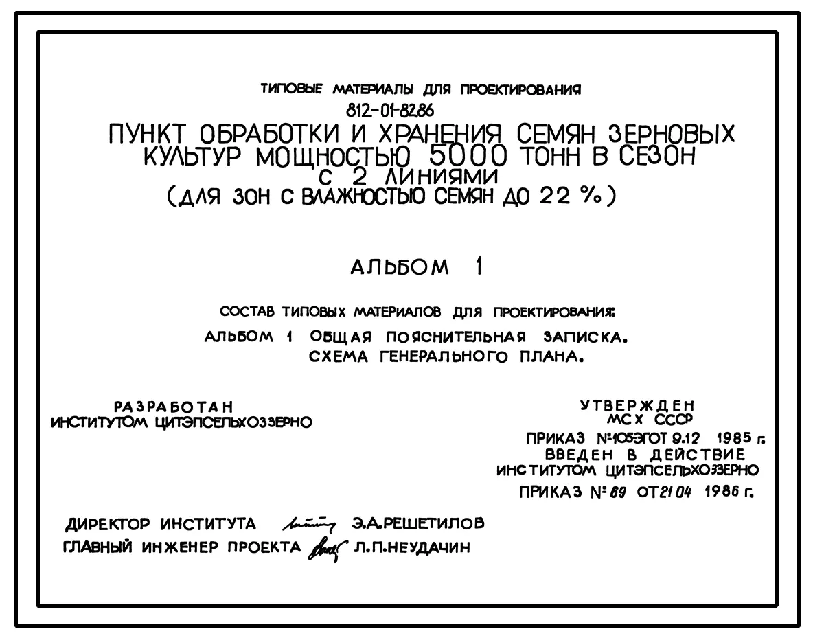 Типовой проект 812-01-82.86 Пункт обработки и хранения семян зерновых культур мощностью 5000 т в сезон с 2 линиями ( для зон с влажностью семян до 22%)