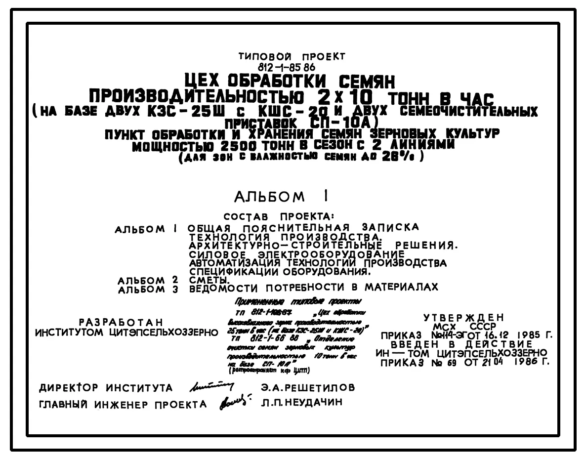 Типовой проект 812-1-85.86 Цех обработки семян производительностью 2х10 т/ч (на базе двух КЗС-25Ш с КШС-20 и двух семяочистительных приставок СП-10А)