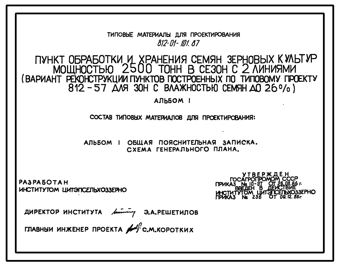 Типовой проект 812-01-101.87 Пункт обработки и хранения семян зерновых культур мощностью 2500 т в сезон с 2 линиями (вариант реконструкции пунктов, построенных по типовому проекту 812-57 для зон с влажностью семян до 26%)