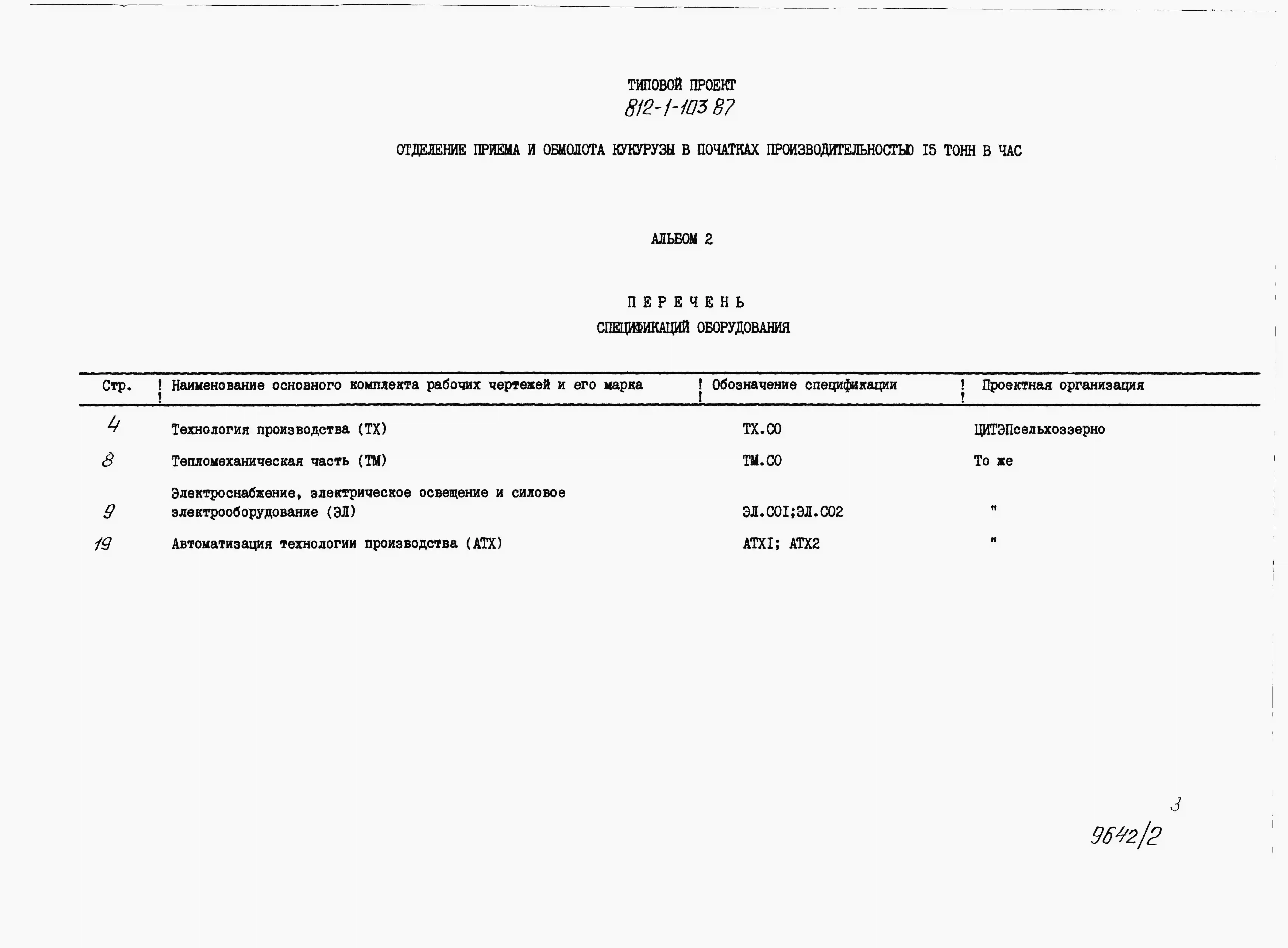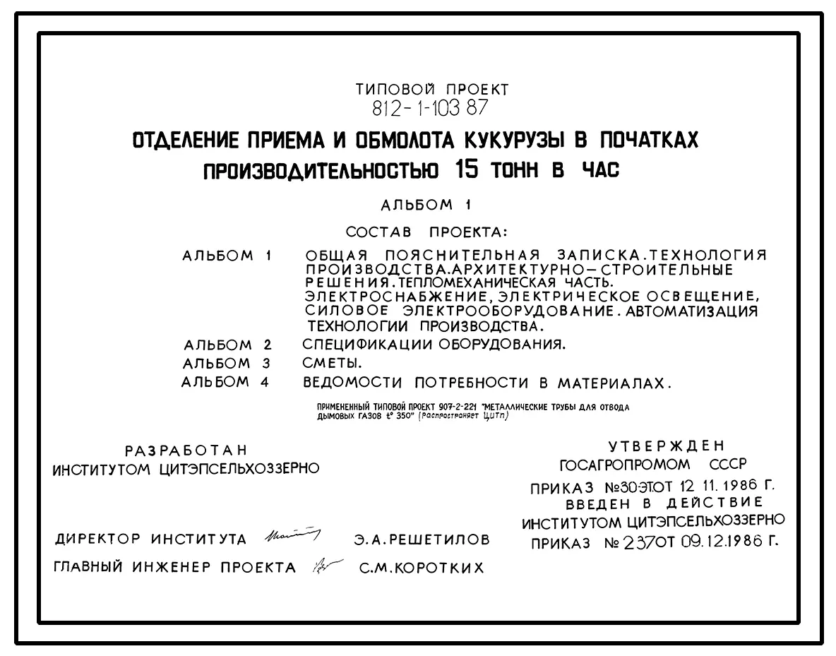 Типовой проект 812-1-103.87 Отделение приема и обмолота кукурузы в початках производительностью 15 т/ч