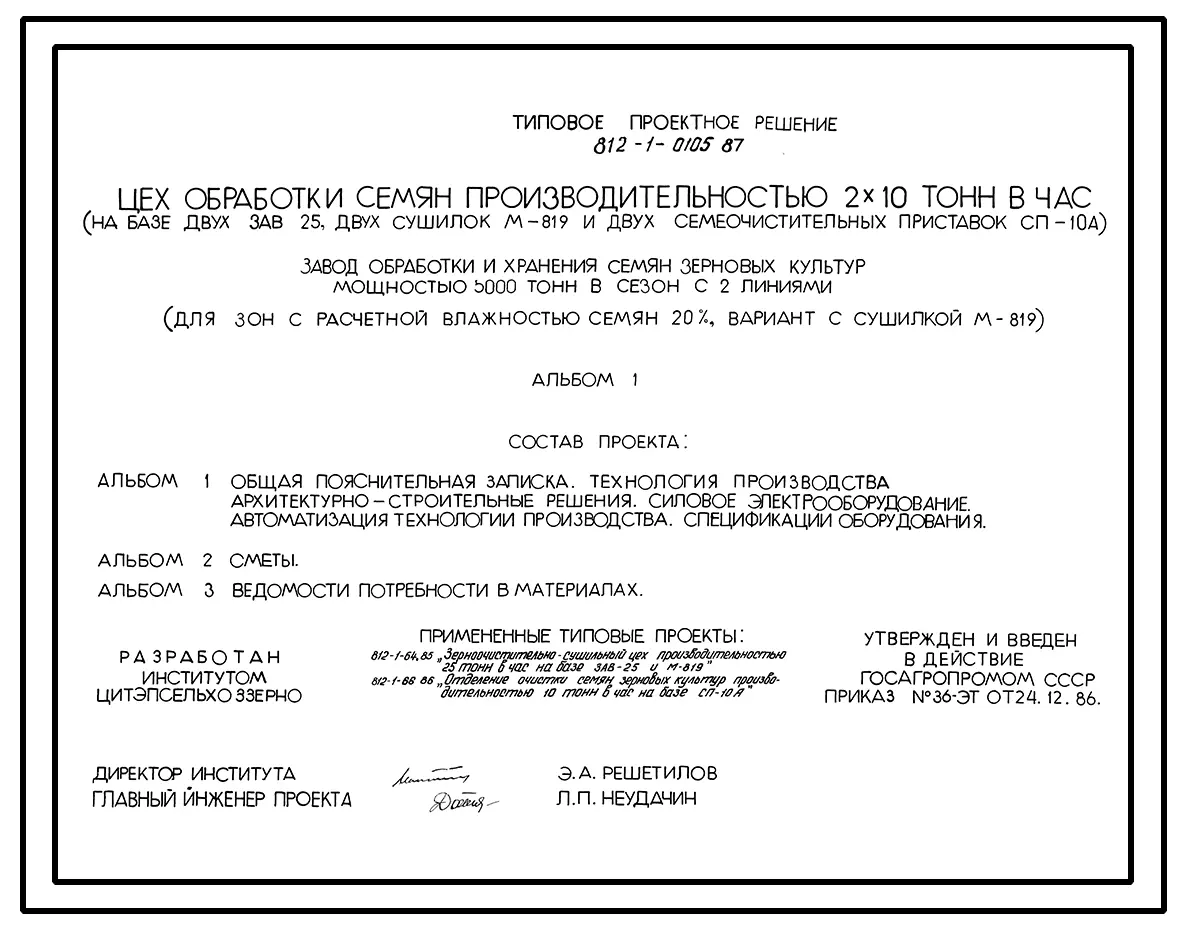 Типовой проект 812-1-0105.87 Цех обработки семян производительностью 2х10 т/ч (на базе двух ЗАВ-25, двух сушилок М-819 и двух семяочистительных приставок СП-10А)