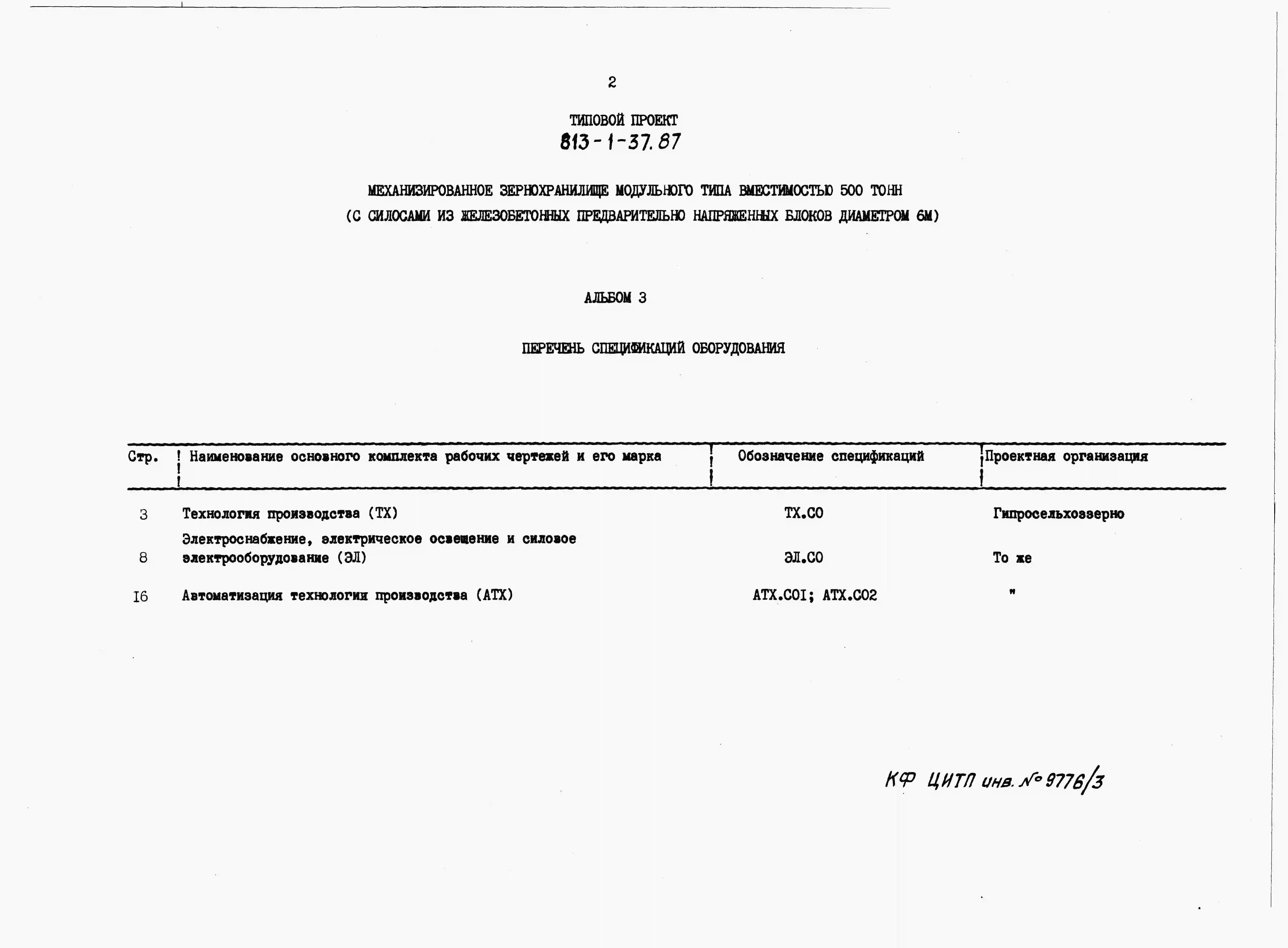 Типовой проект 813-1-37.87 Механизированное зернохранилище модульного типа вместимостью 500 т (с силосами из железобетонных предварительно напряженных блоков диаметром 6 м)