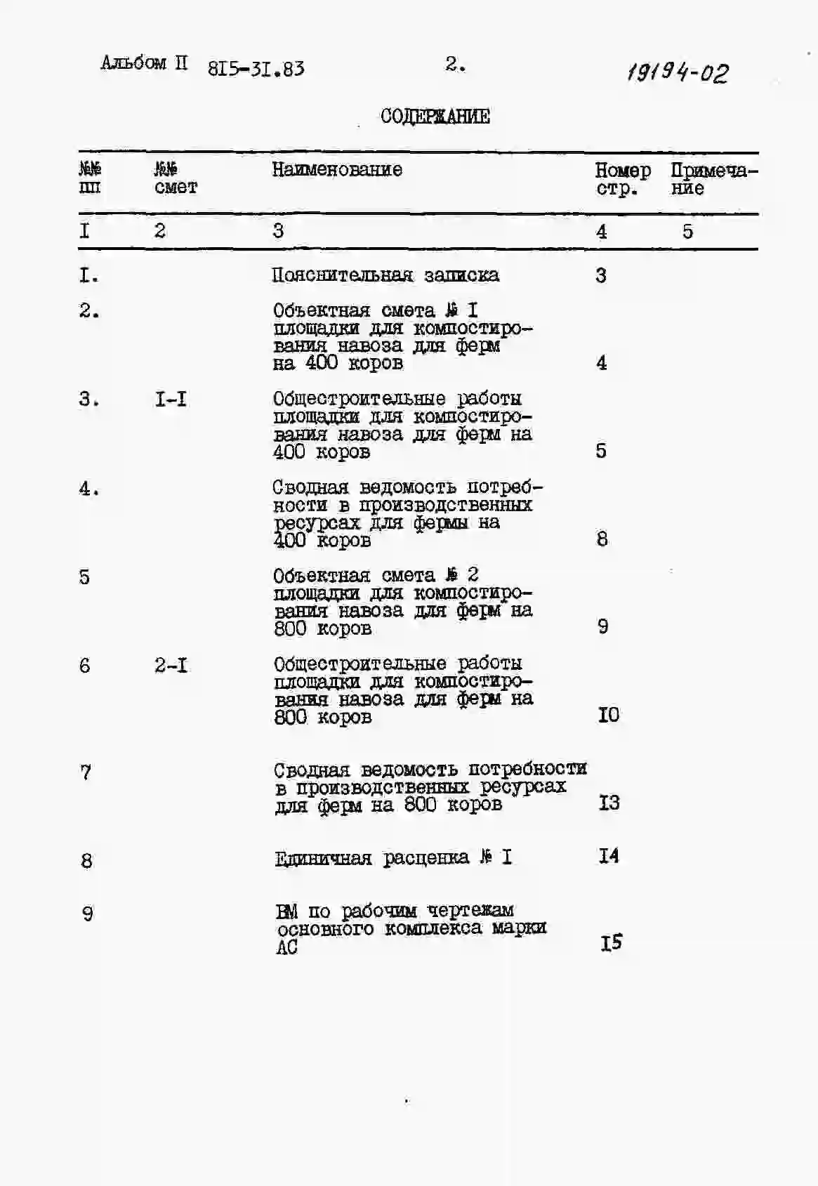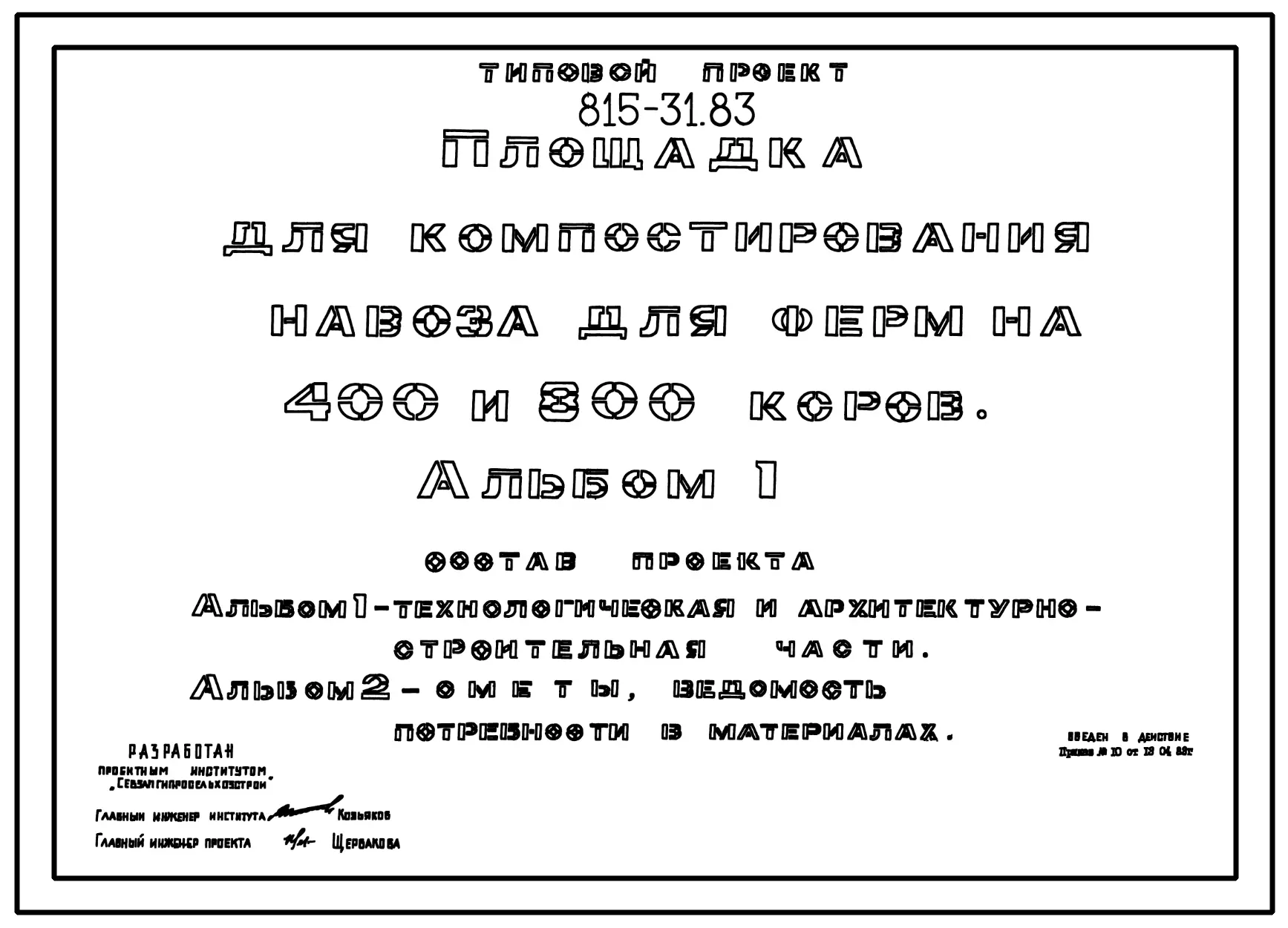Типовой проект 815-31.83 Площадка для компостирования навоза для ферм на 400 и 800 коров. Размеры площадок - 34x53,5 и 34x94,5 м. Расчетная температура: -30°С. Покрытие площадки - монолитный бетон