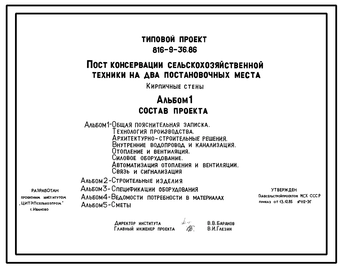 Типовой проект 816-9-36.86 Пункт консервации сельскохозяйственной техники на 2 постановочных места. Предназначен для проведения работ по техническому обслуживанию сельхозтехники при подготовке ее к хранению. Размеры здания - 18x18 м. Расчетная температура