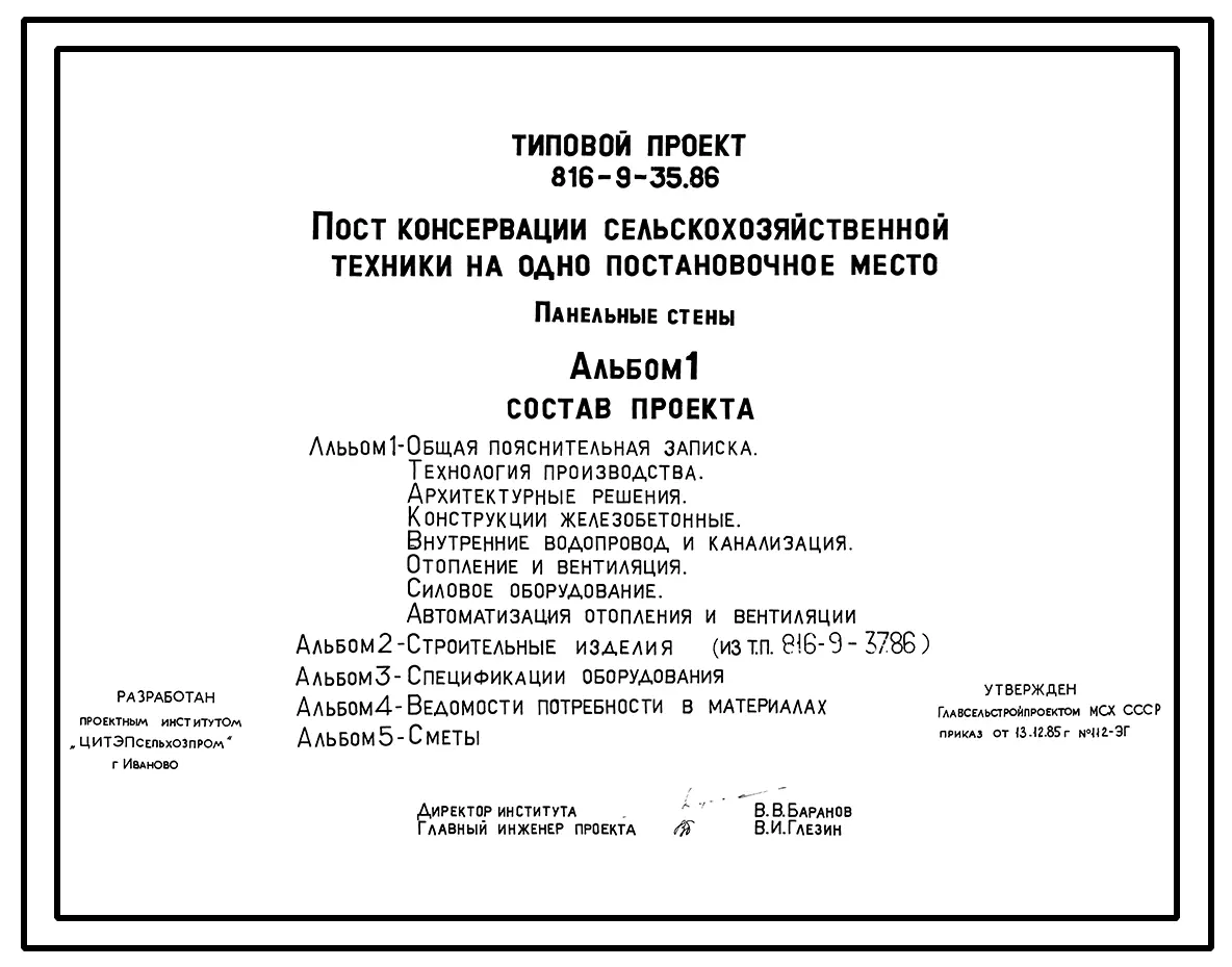 Типовой проект 816-9-35.86 Пункт консервации сельскохозяйственной техники на 1 постановочное место. Предназначен для проведения работ по техническому обслуживанию сельхозтехники при подготовке ее к хранению. Размеры здания - 9x18 м. Расчетная температура: