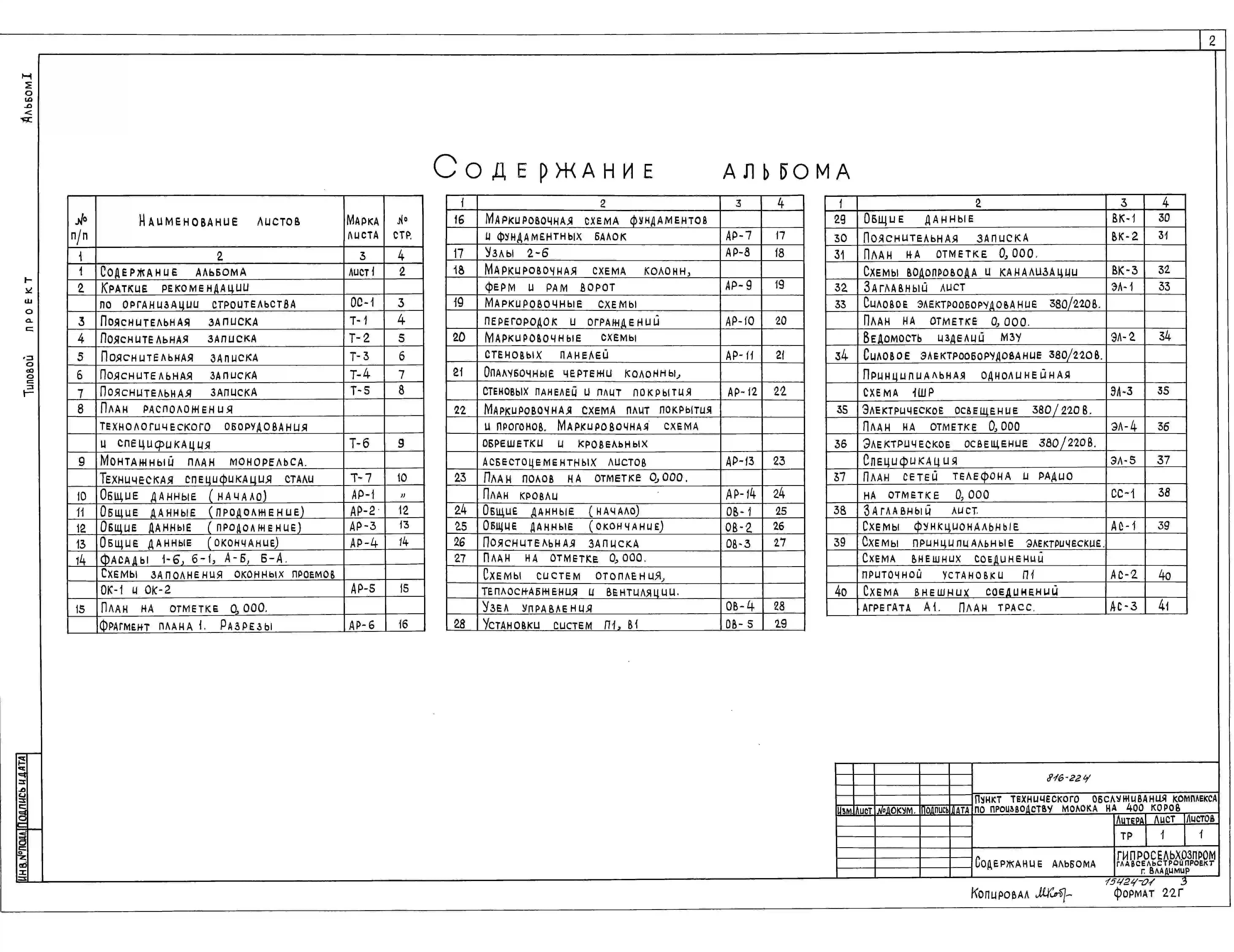 Типовой проект 816-224 Пункт технического обслуживания комплекса по производству молока на 400 коров. Предназначен для технического обслуживания и ремонта оборудования комплекса. Размеры здания - 9x18 м. Расчетная температура: -20, -30, -40°С. Стены - пан