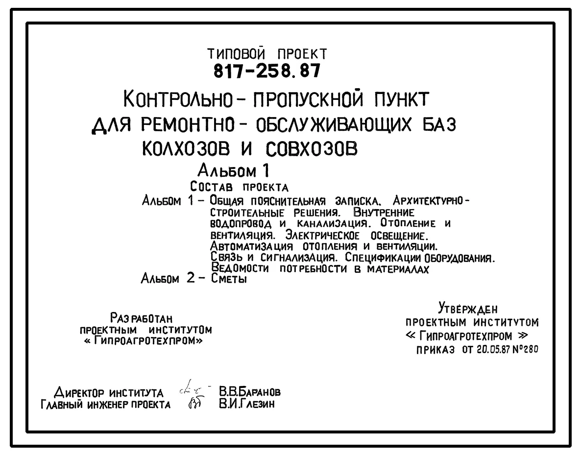Типовой проект 817-258.87 Контрольно-пропускной пункт для ремонтнообслуживаюших баз колхозов и совхозов. Предназначен для диспетчерской службы, контроля проезда транспортных средств и прохода работающих на территорию объектов. Размеры здания - 6x7,5 м. Ра