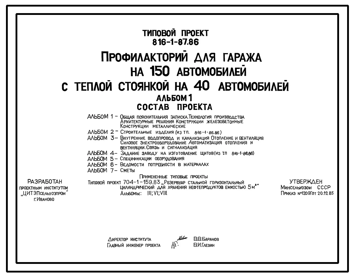 Типовой проект 816-1-87.86 Профилакторий дли гаража на 150 автомобилей с теплой стоянкой на 40 автомобилей. Предназначен для ремонта, технического обслуживания и межсменного хранения автомобилей. Размеры здания - 30x42 + 36x42 м. Стены - панельные легкобе