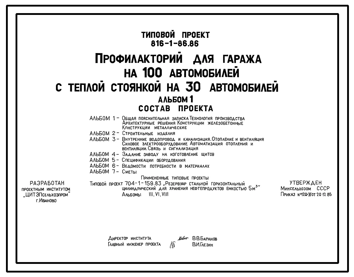 Типовой проект 816-1-86.86 Профилакторий для гаража на 100 автомобилей с теплой стоянкой на 30 автомобилей. Предназначен для ремонта, технического обслуживания и межсменного хранения автомобилей. Размеры здания - 30x36 + 36x30 м. Расчетная температура: -3