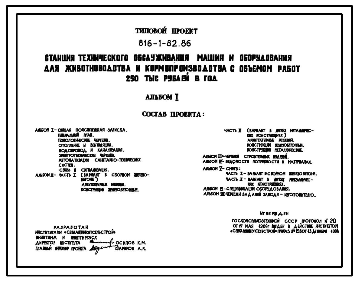 Типовой проект 816-1-82.86 Станция технического обслуживания машин и оборудования для животноводства и кормопроизводства с объемом работ 350 тыс. руб. в год