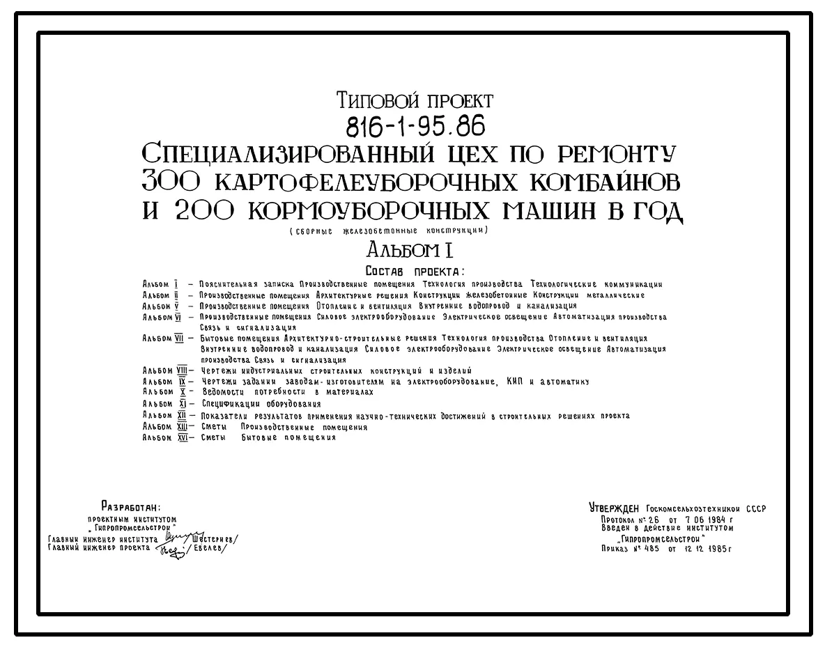 Типовой проект 816-1-95.86 Специализированный цех по ремонту 300 картофелеуборочных комбайнов и 200 кормоуборочных машин в год (сборные железобетонные конструкции)
