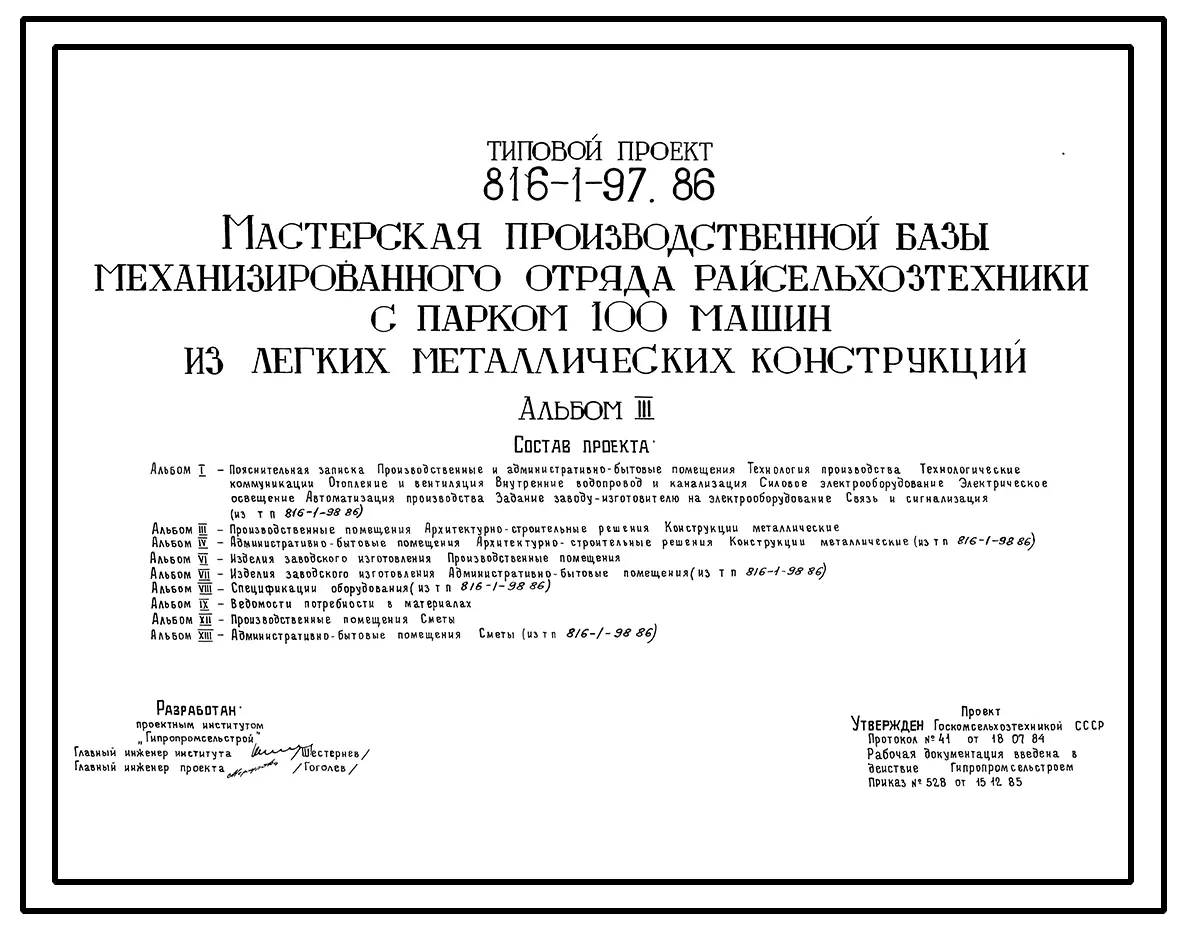 Типовой проект 816-1-97.86 Мастерская производственной базы механизированного отряда райсельхозтехники с парком на 100 машин из легких металлических конструкций