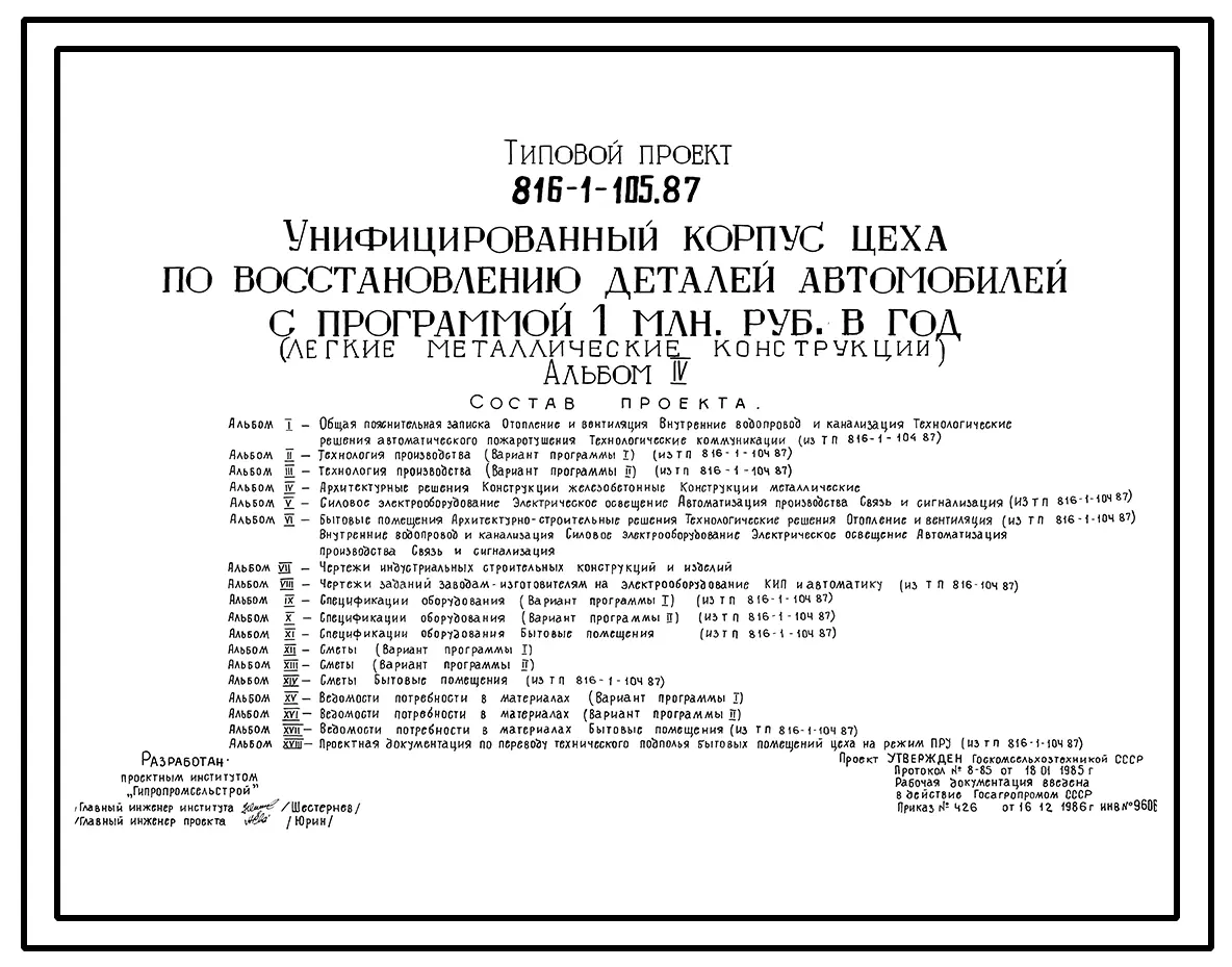 Типовой проект 816-1-105.87 Унифицированный корпус цеха по восстановлению деталей автомобилей с программой 1 млн. руб. в год (легкие металлические конструкции)