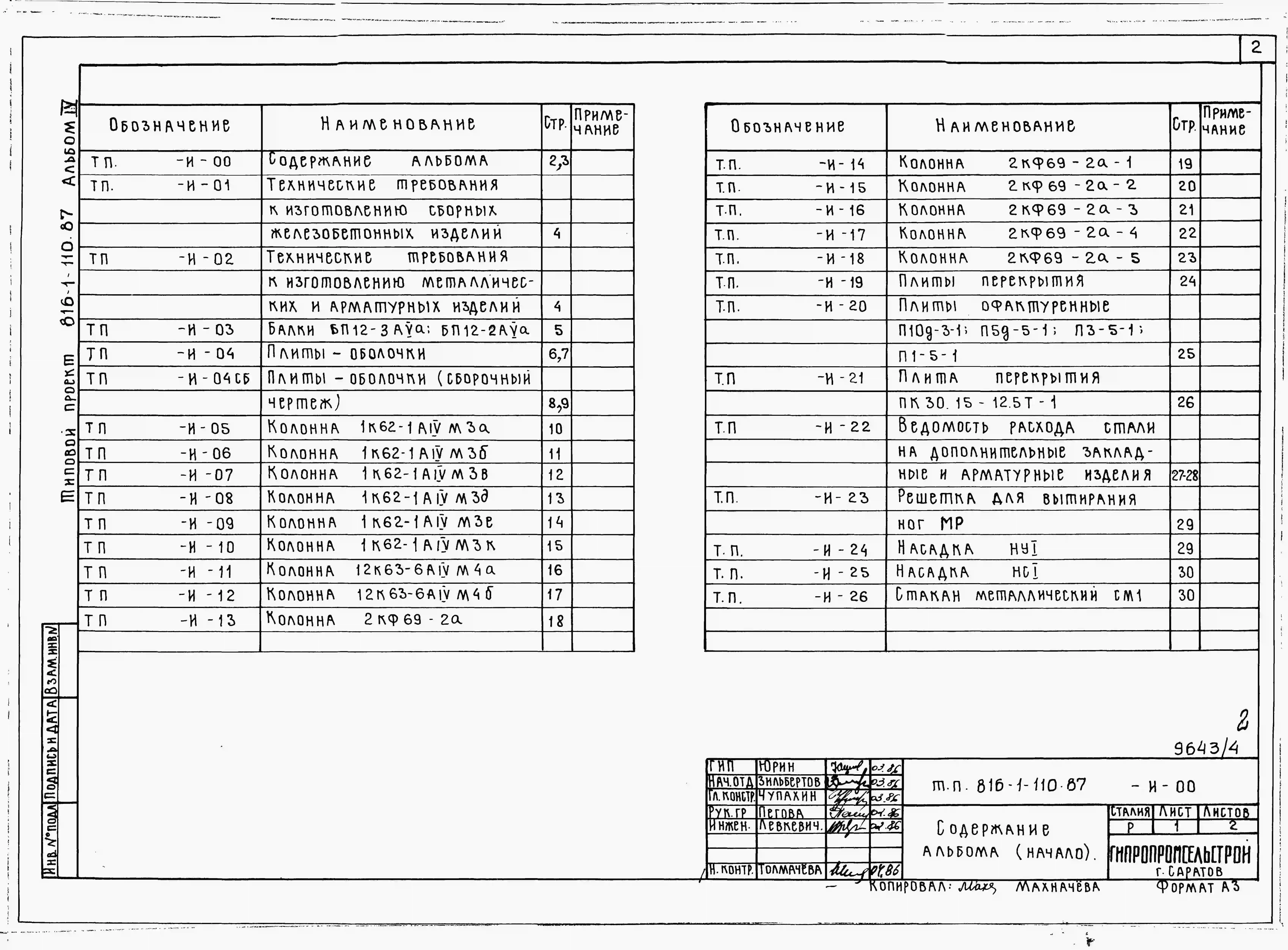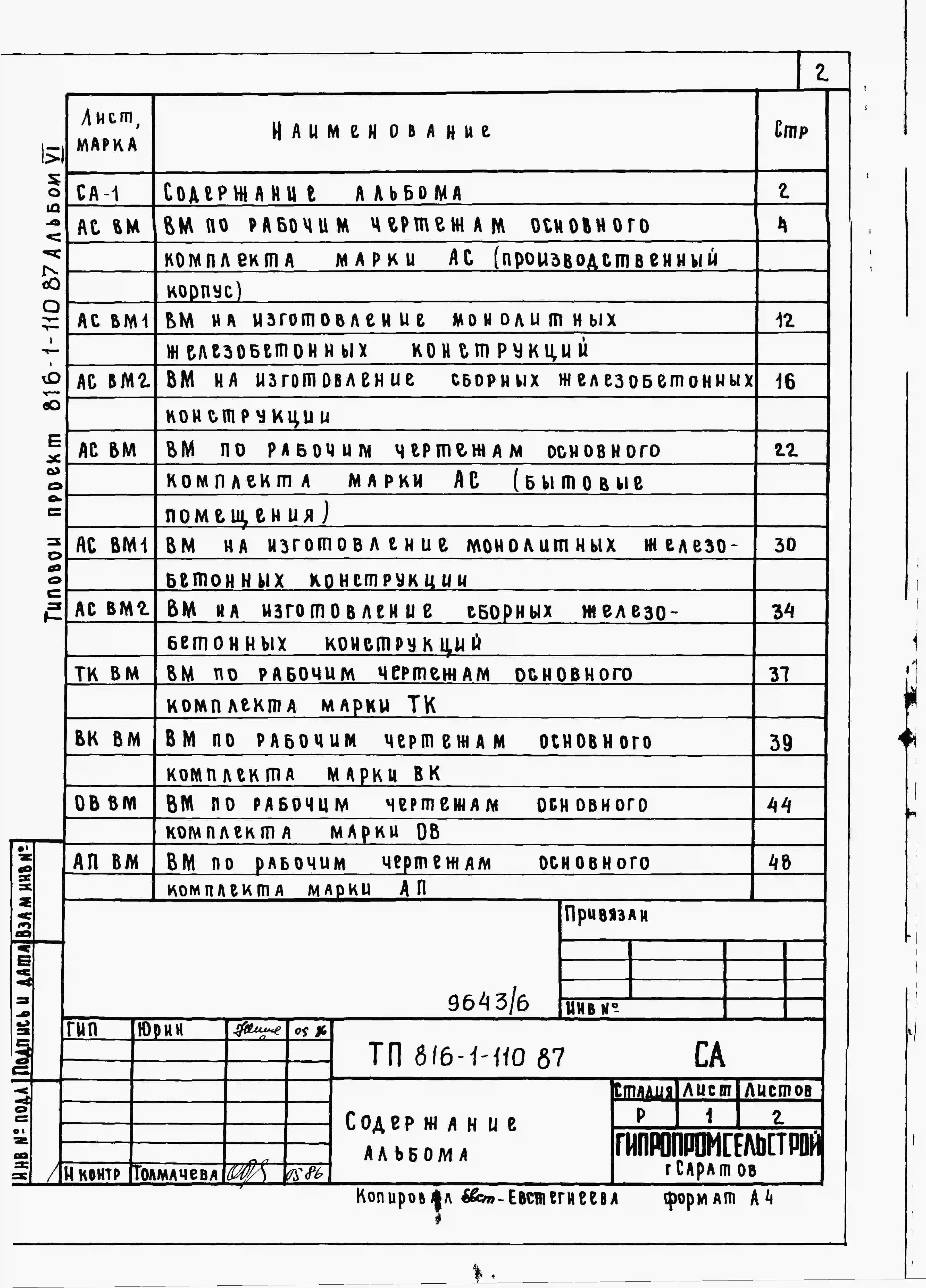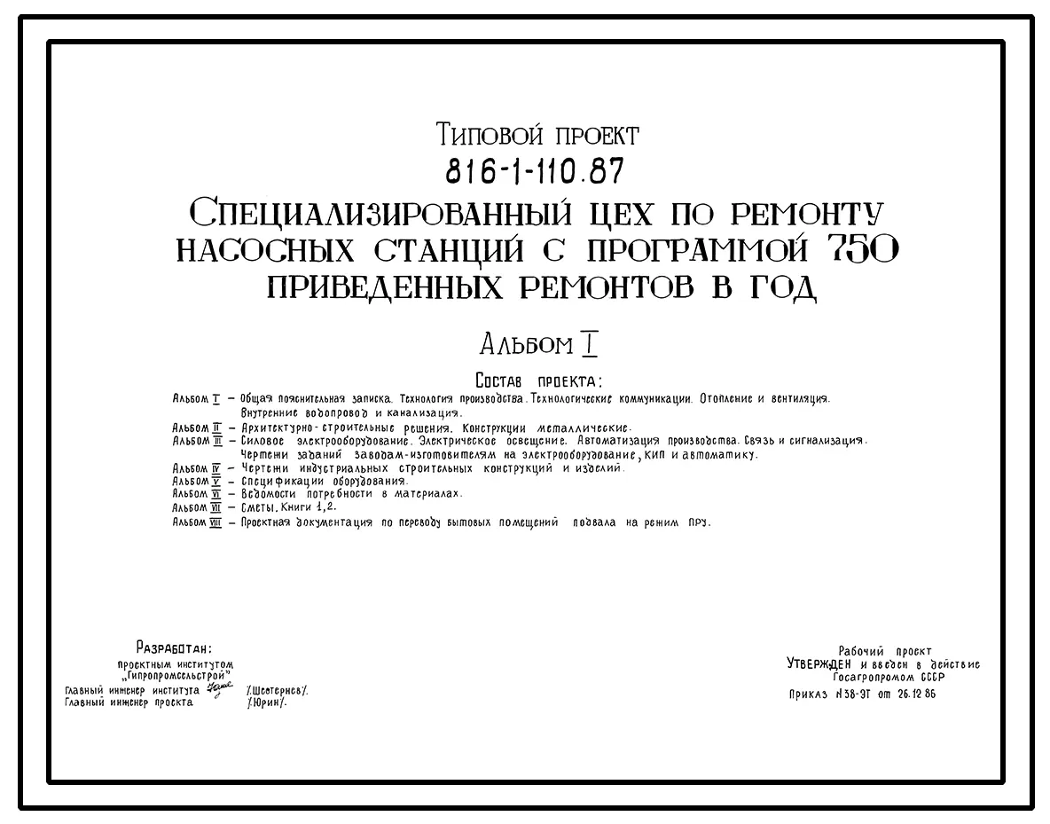 Типовой проект 816-1-110.87 Специализированный цех по ремонту насосных станций с программой 750 приведенных ремонтов в год. Стены из легкобетонных панелей и кирпича. Покрытие из железобетонных плит по железобетонным балкам