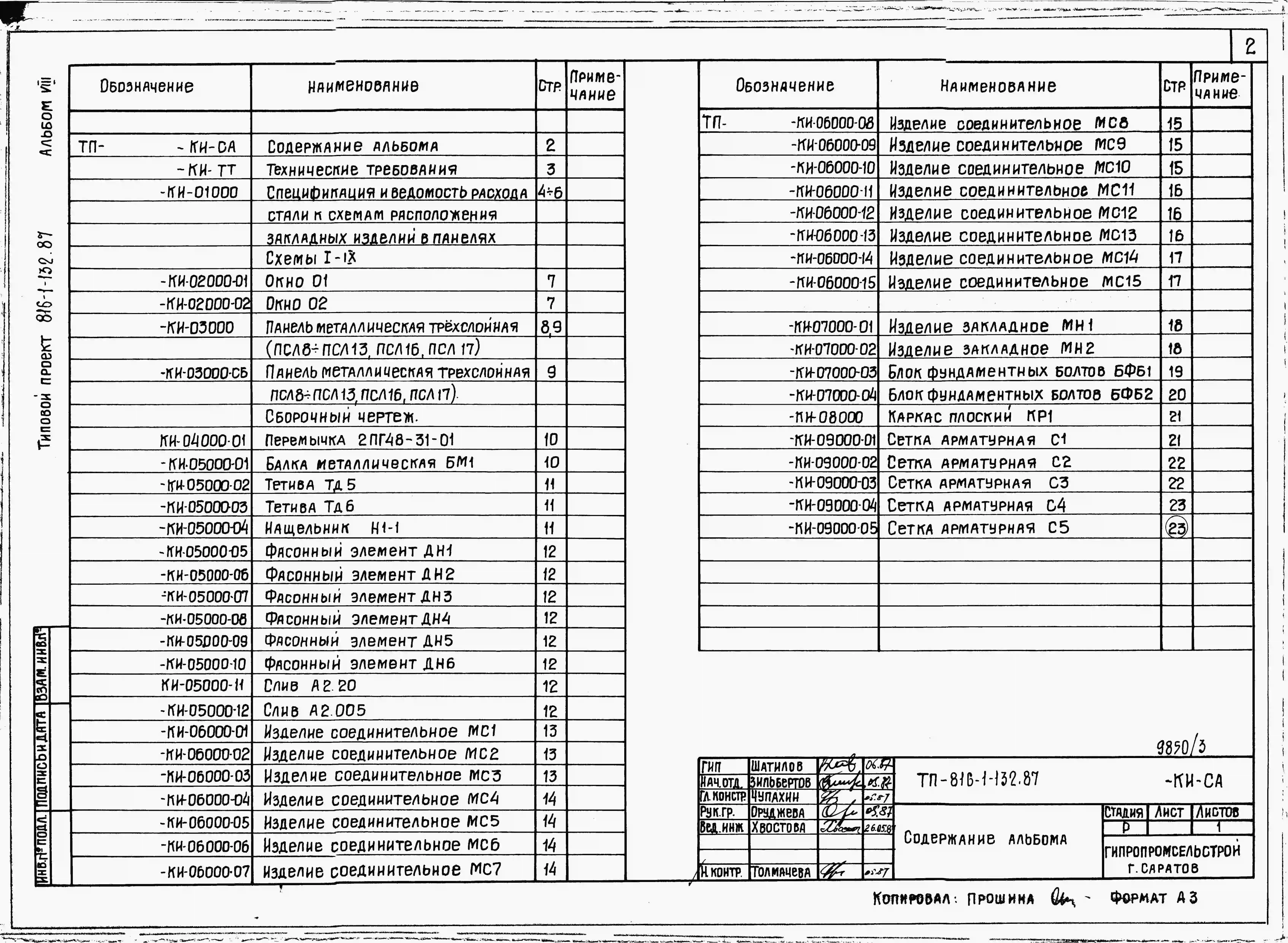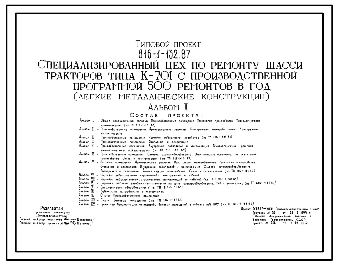 Типовой проект 816-1-132.87 Специализированный цех по ремонту шасси тракторов типа К-701 с производственной программой 500 ремонтов в год (легкие металлические конструкции). Стены из легкобетонных панелей и кирпича. Покрытие — структурные конструкции из п