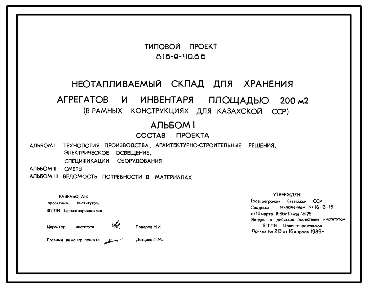 Типовой проект 816-9-40.86 Неотапливаемый склад для хранения агрегатов и инвентаря площадью 200 м?. Стены из легкобетонных панелей. Покрытие из железобетонных плит по железобетонным рамам