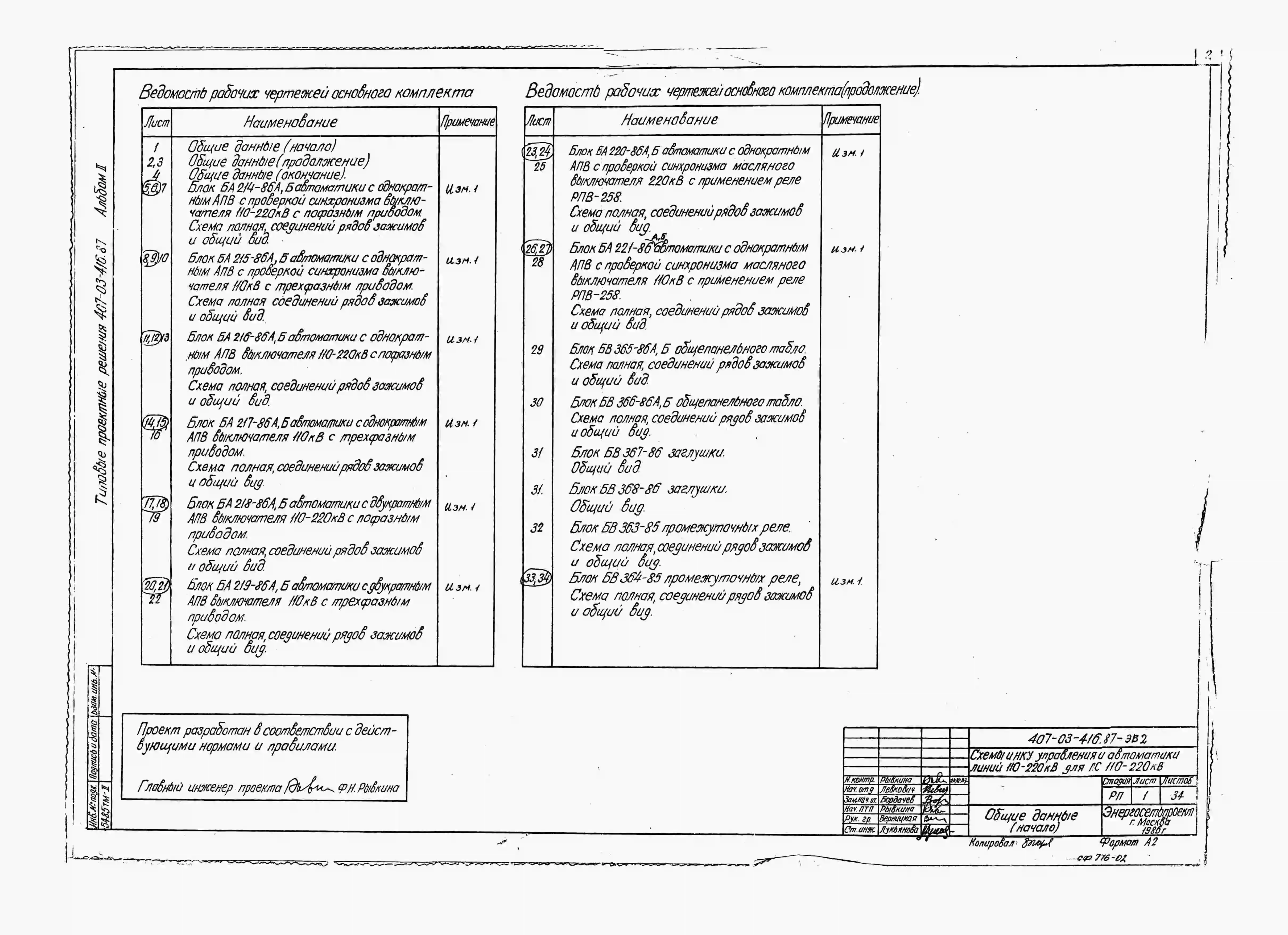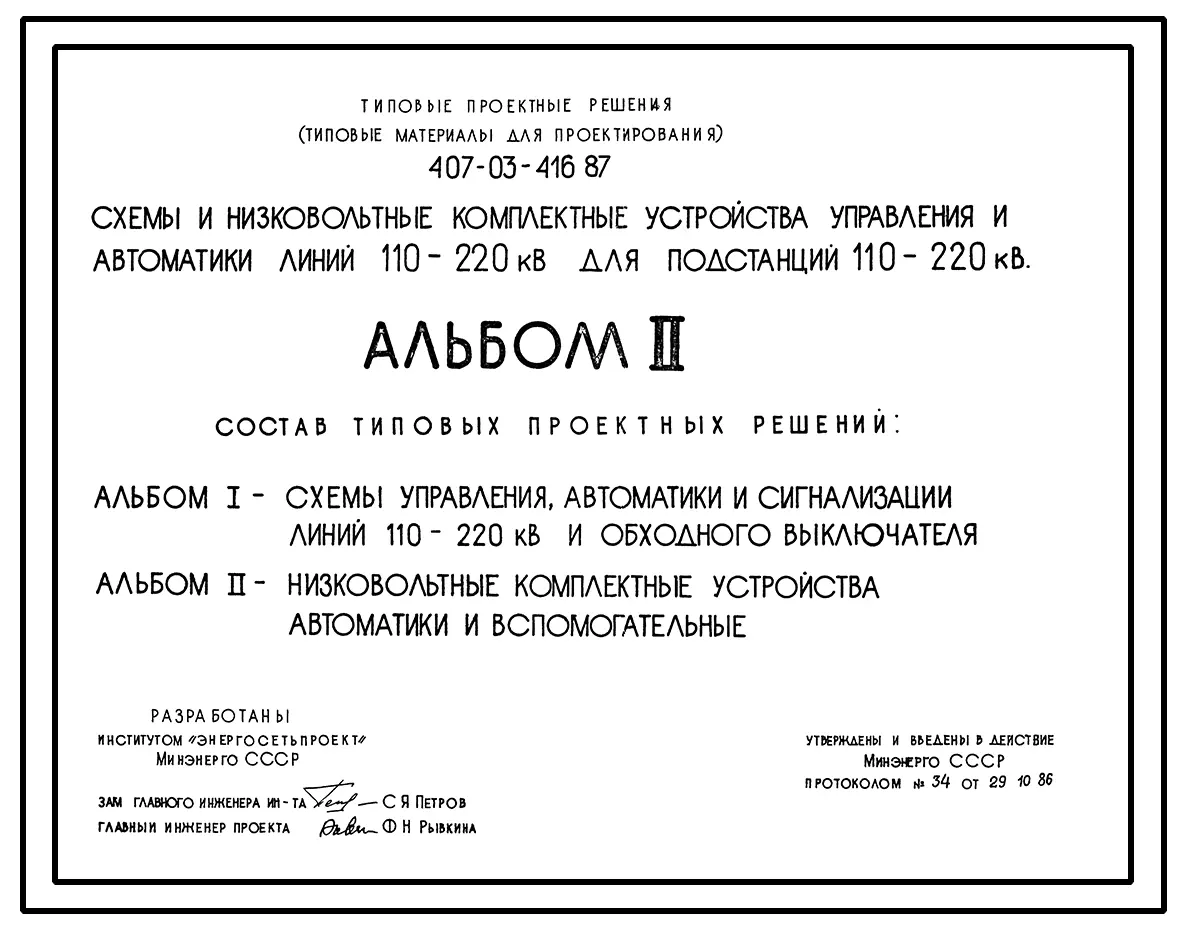 Типовой проект 407-03-416.87 Схемы и низковольтные комплектные устройства управления и автоматики линий 110-220 кВ для подстанций 110-220 кВ