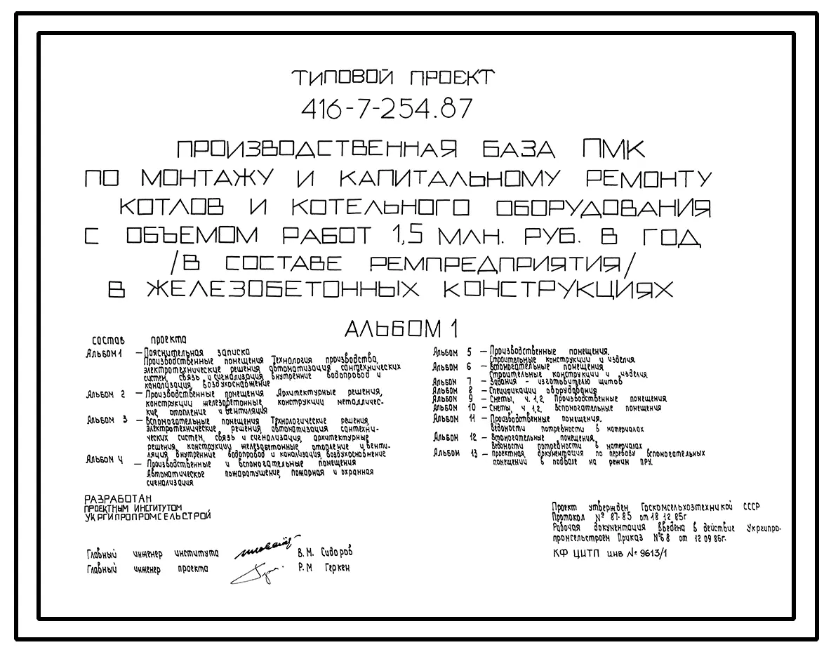 Типовой проект 416-7-254.87 Производственная база ПМК по монтажу и капитальному ремонту котлов и котельного оборудования с объемом работ 1,5 млн.руб. в год (в составе ремпредприятия) в железобетонных конструкциях