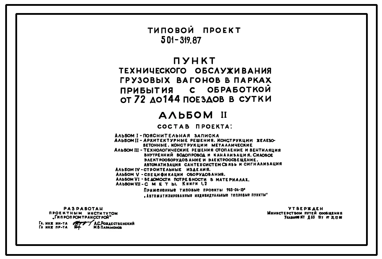 Типовой проект 501-319.87 Пункт технического обслуживания грузовых вагонов в парках прибытия с обработкой от 72 до 144 поездов в сутки