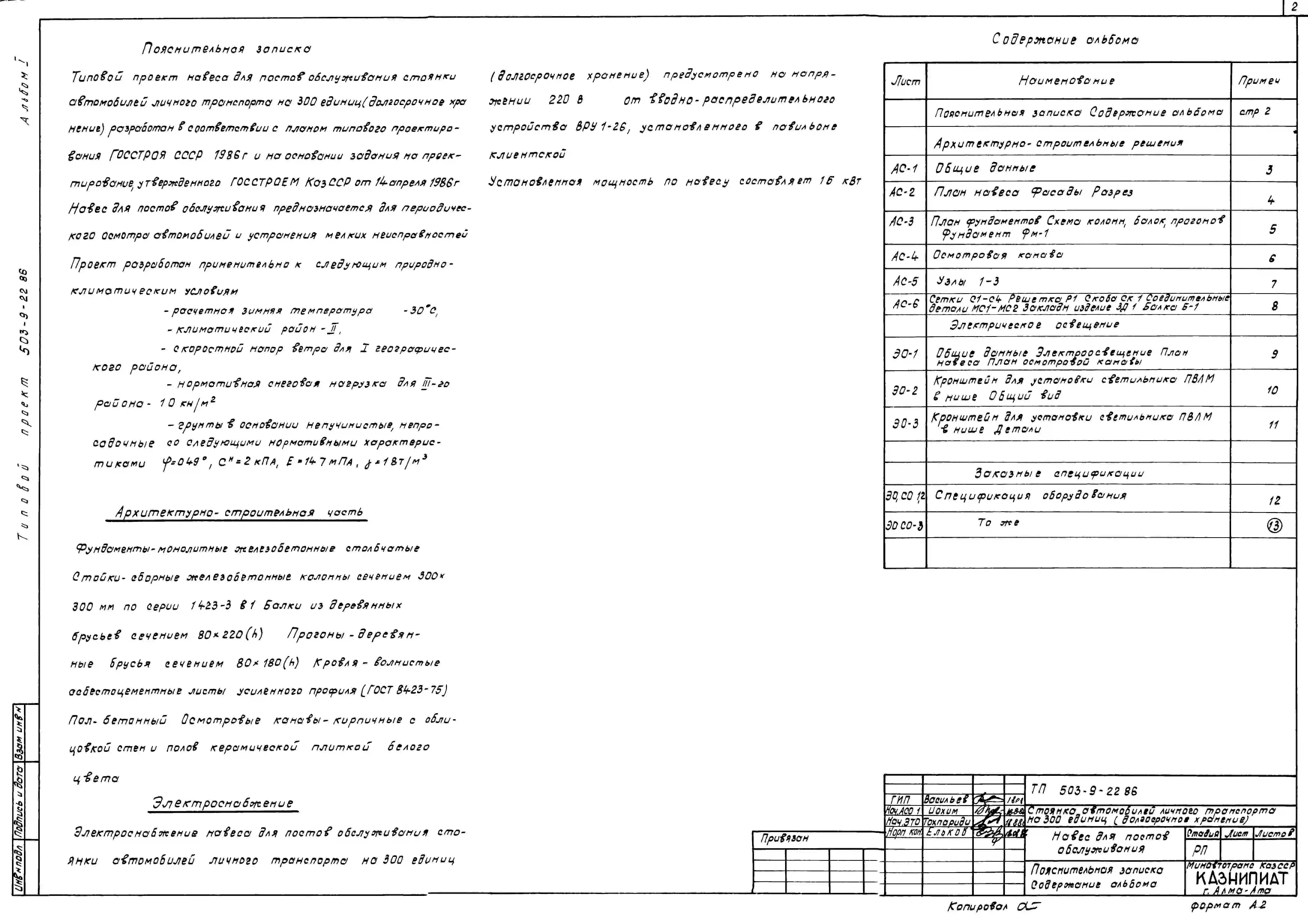 Типовой проект 503-9-22.86 Навес для постов обслуживания стоянки автомобилей личного транспорта на 300 единиц (долгосрочное хранение)