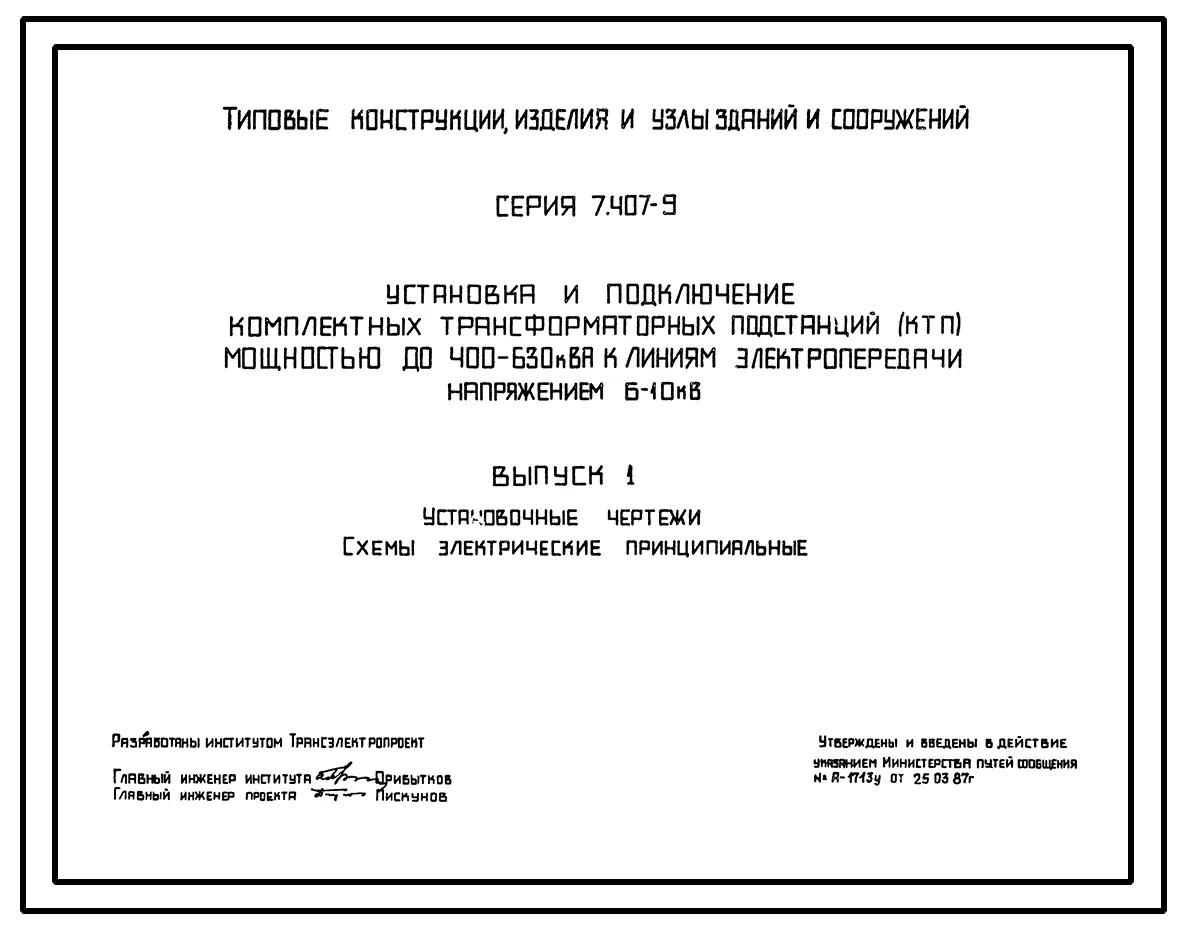 Серия 7.407-9 Установка и подключение трансформаторных подстанций (КТБ) мощностью до 400-630 кВА к линиям электропередач напряженностью 6/10 кВ. Рабочие чертежи.