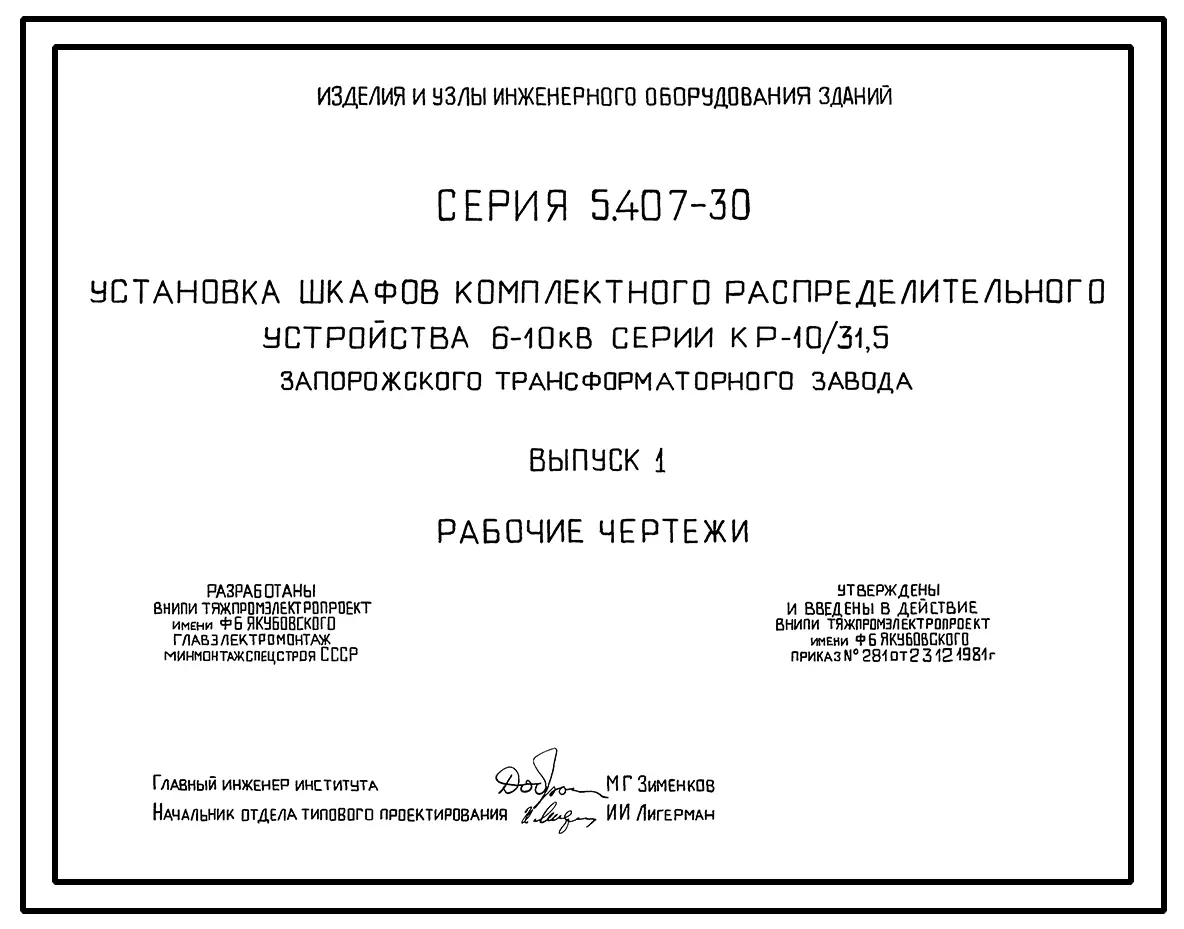 Серия 5.407-30 Установка шкафов комплектного распределительного устройства 6-10 кВ серии КР-10/31,5 Запорожского трансформаторного завода. Материалы для проектирования и рабочие чертежи.