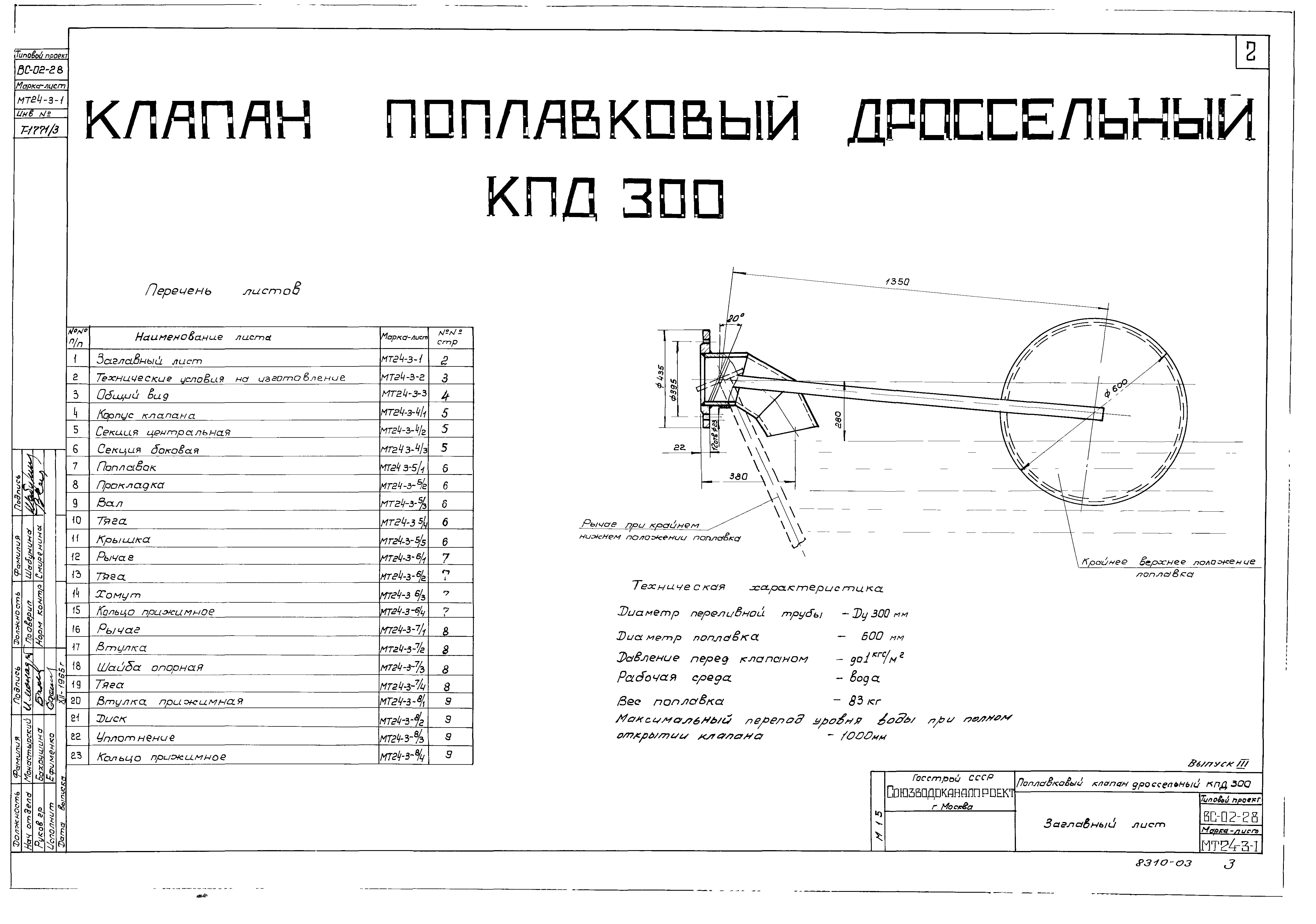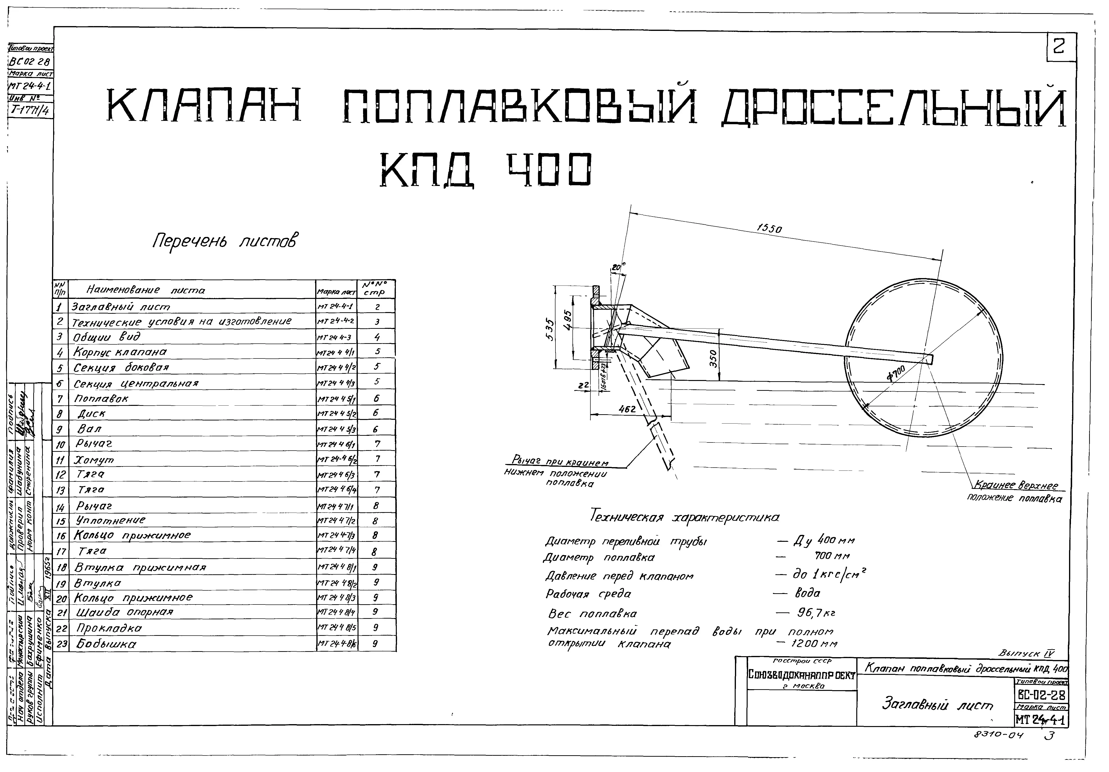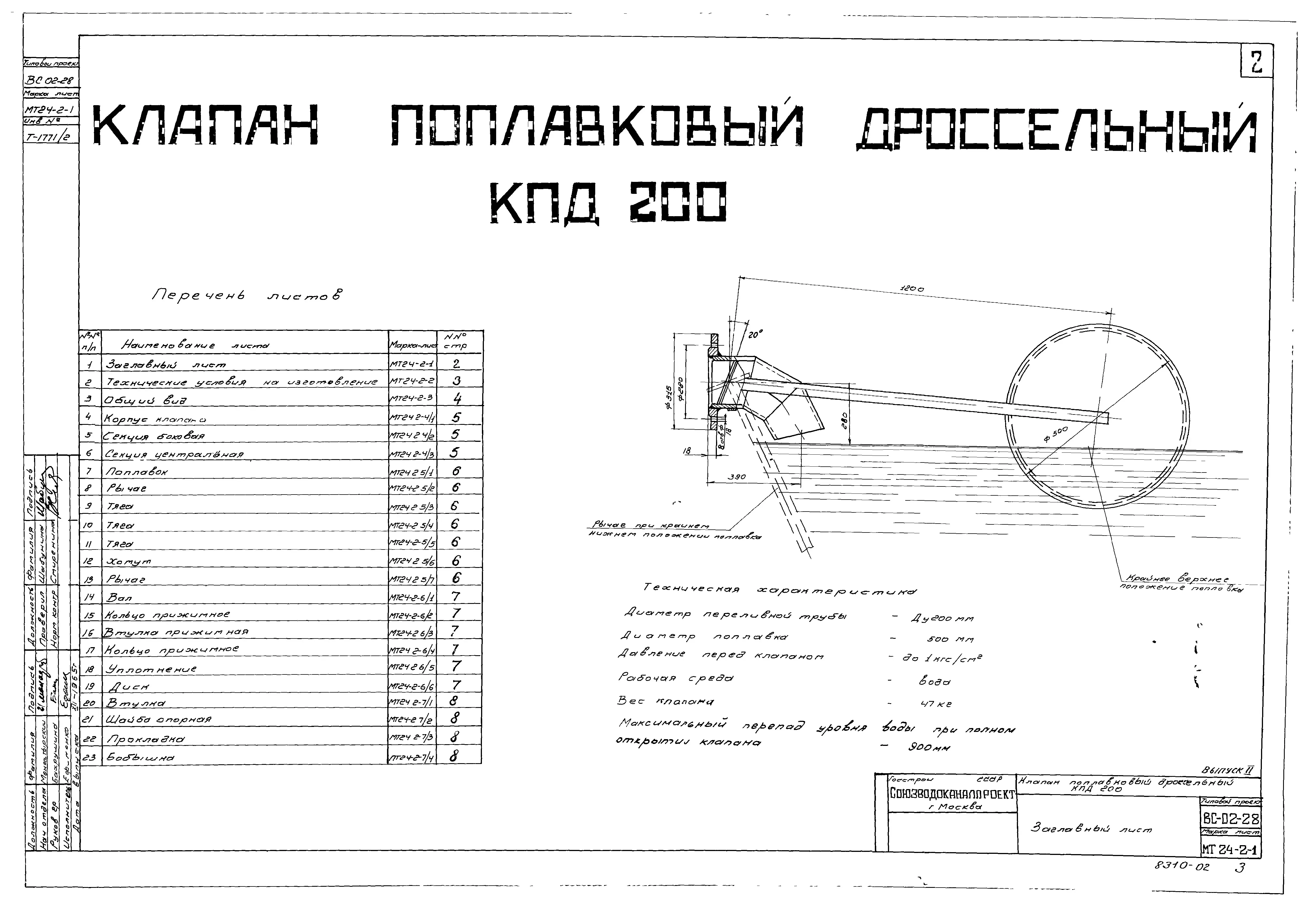 Серия ВС-02-28 Клапан поплавковый дроссельный в сварном исполнении Ру 1 кгс/ см.кв Ду100 ,200, 300,400. Рабочие чертежи.