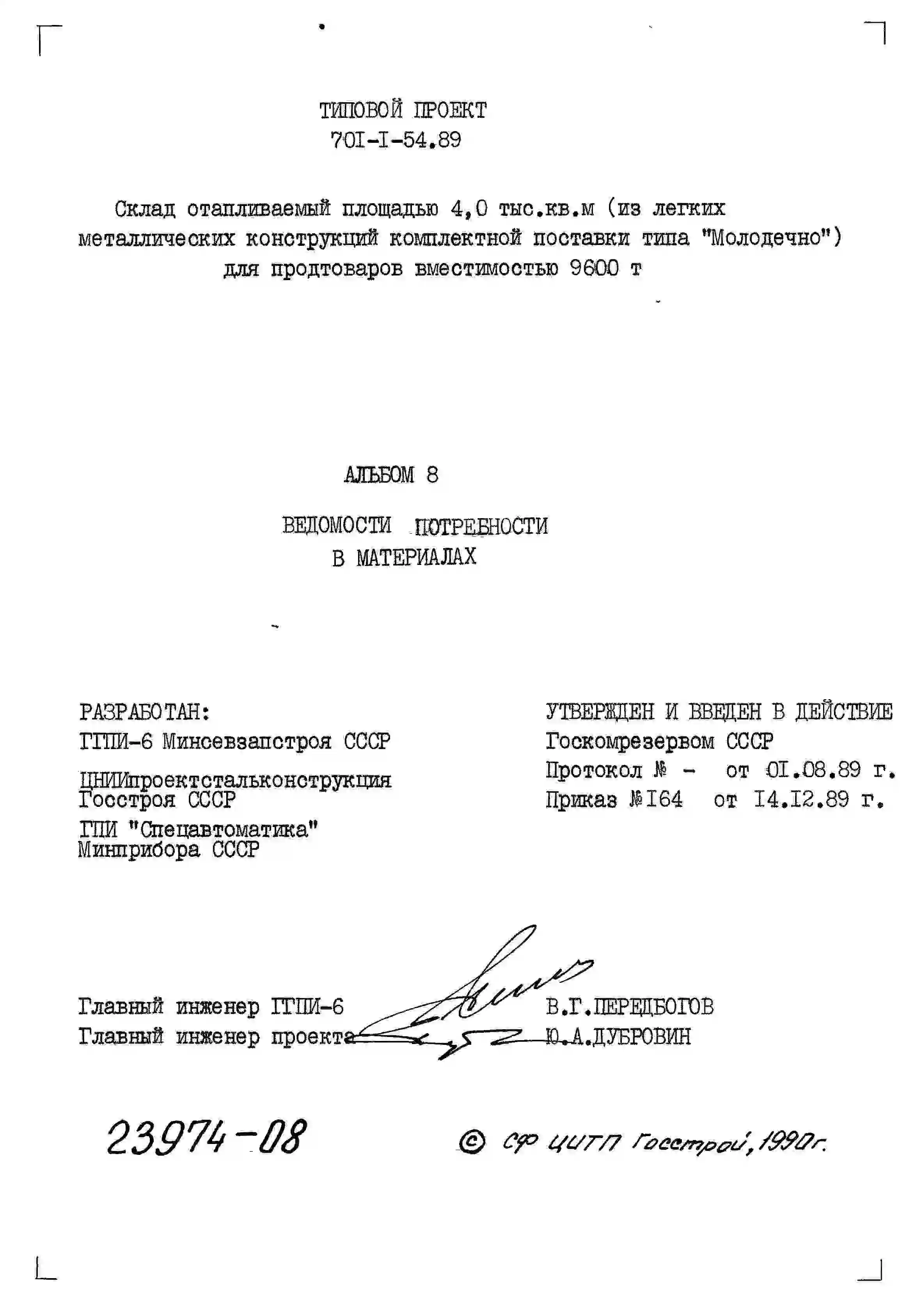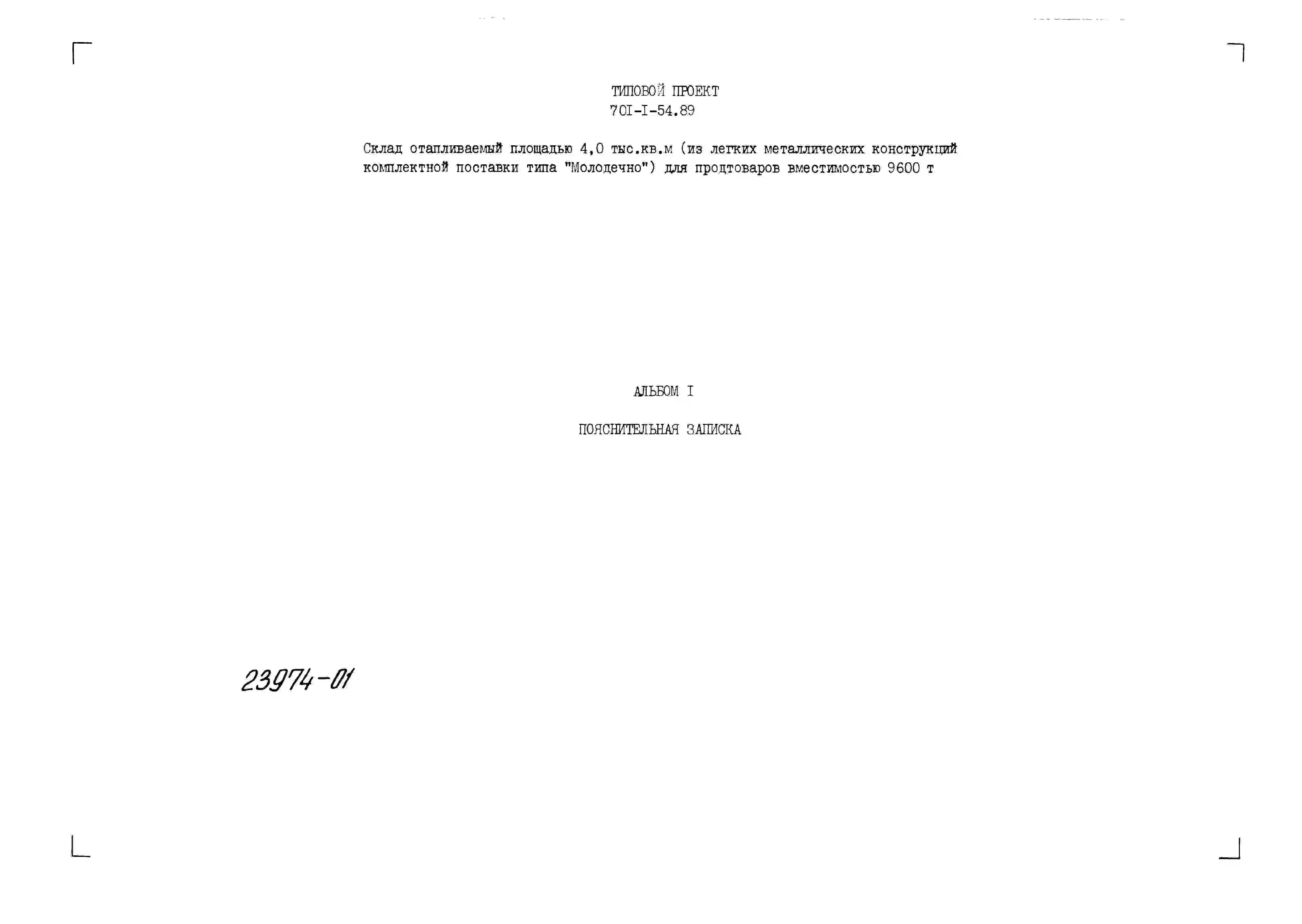 Типовой проект 701-1-54.89 Склад отапливаемый площадью 4000 м2 (из ЛМК комплектной поставки типа “Молодечно”) для продтоваров вместимостью 9600 т