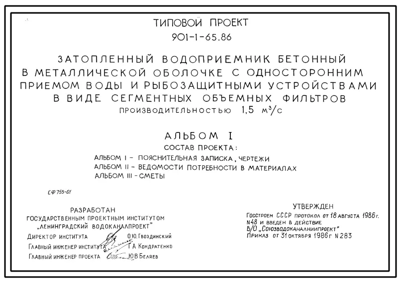 Типовой проект 901-1-65.86 Затопленный водоприемник бетонный в металлической оболочке с односторонним приемом воды и рыбозащитными устройствами в виде сегментных объемных фильтров производительностью 1,5 м3/с