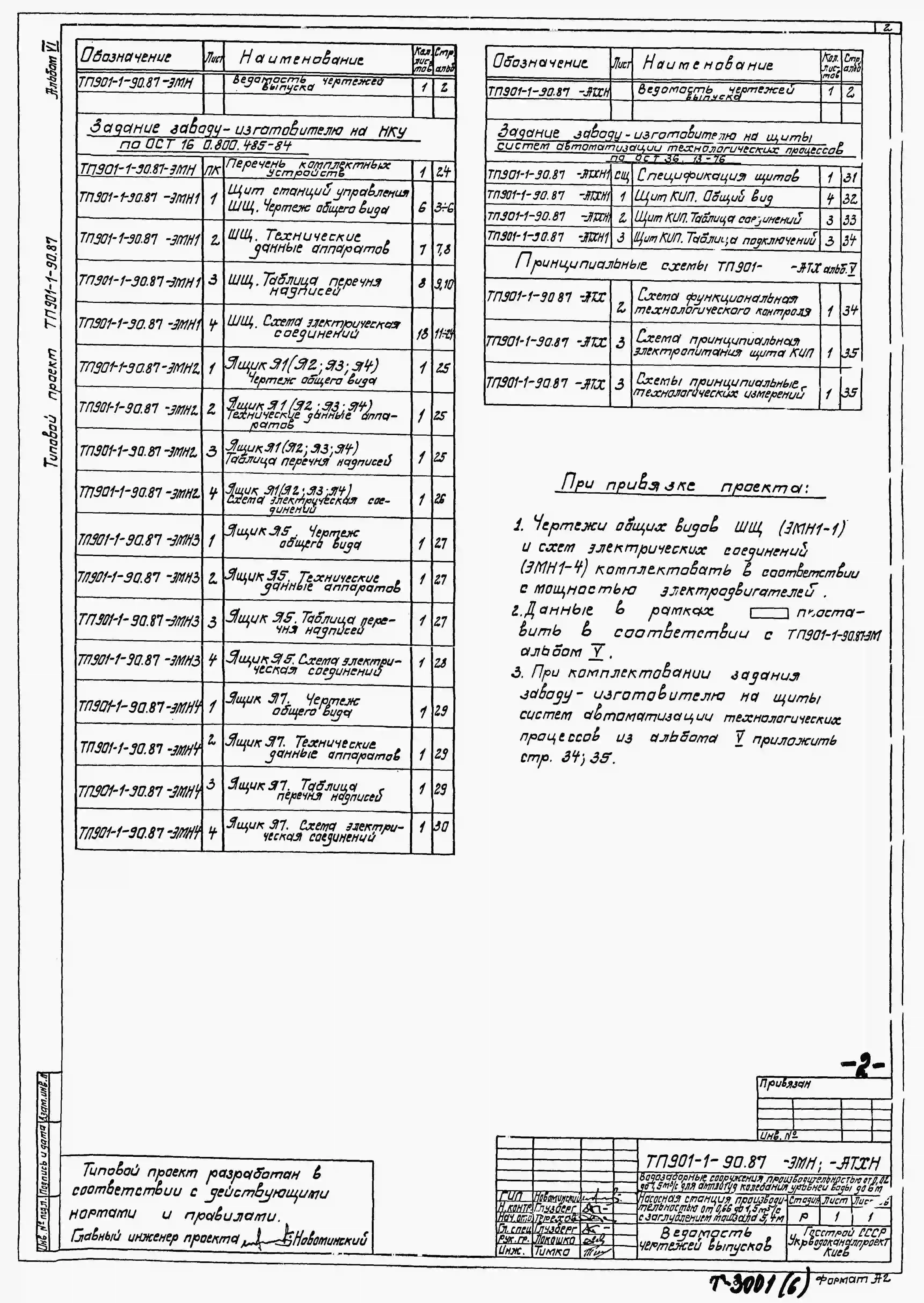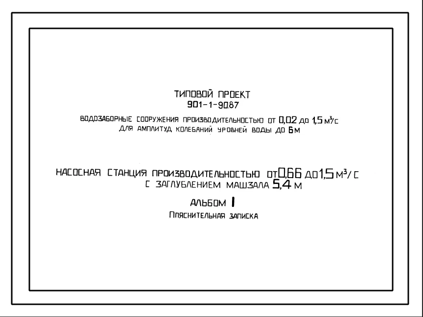 Типовой проект 901-1-90.87 Насосная станция производительностью от 0,66 до 1,5 м3/с с заглублением машзала 5,4 м (для водозаборных сооружений производительностью от 0,02 до 1,5м3/с для амплитуд колебаний уровней воды до 6 м)