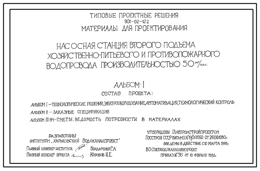 Типовой проект 901-02-122 Насосная станция второго подъема хозяйственно-питьевого и противопожарного водопровода производительностью 50 м3/ч