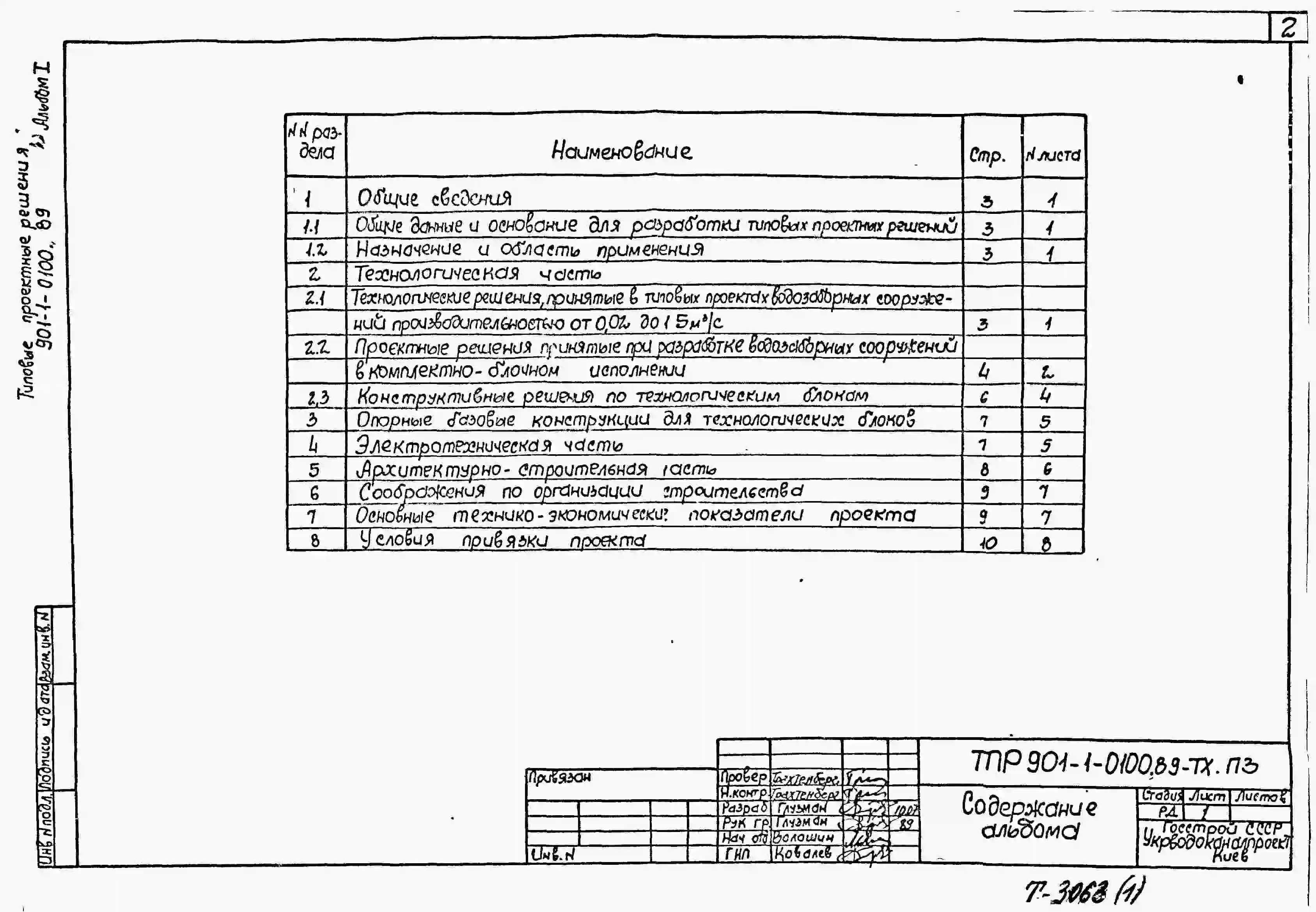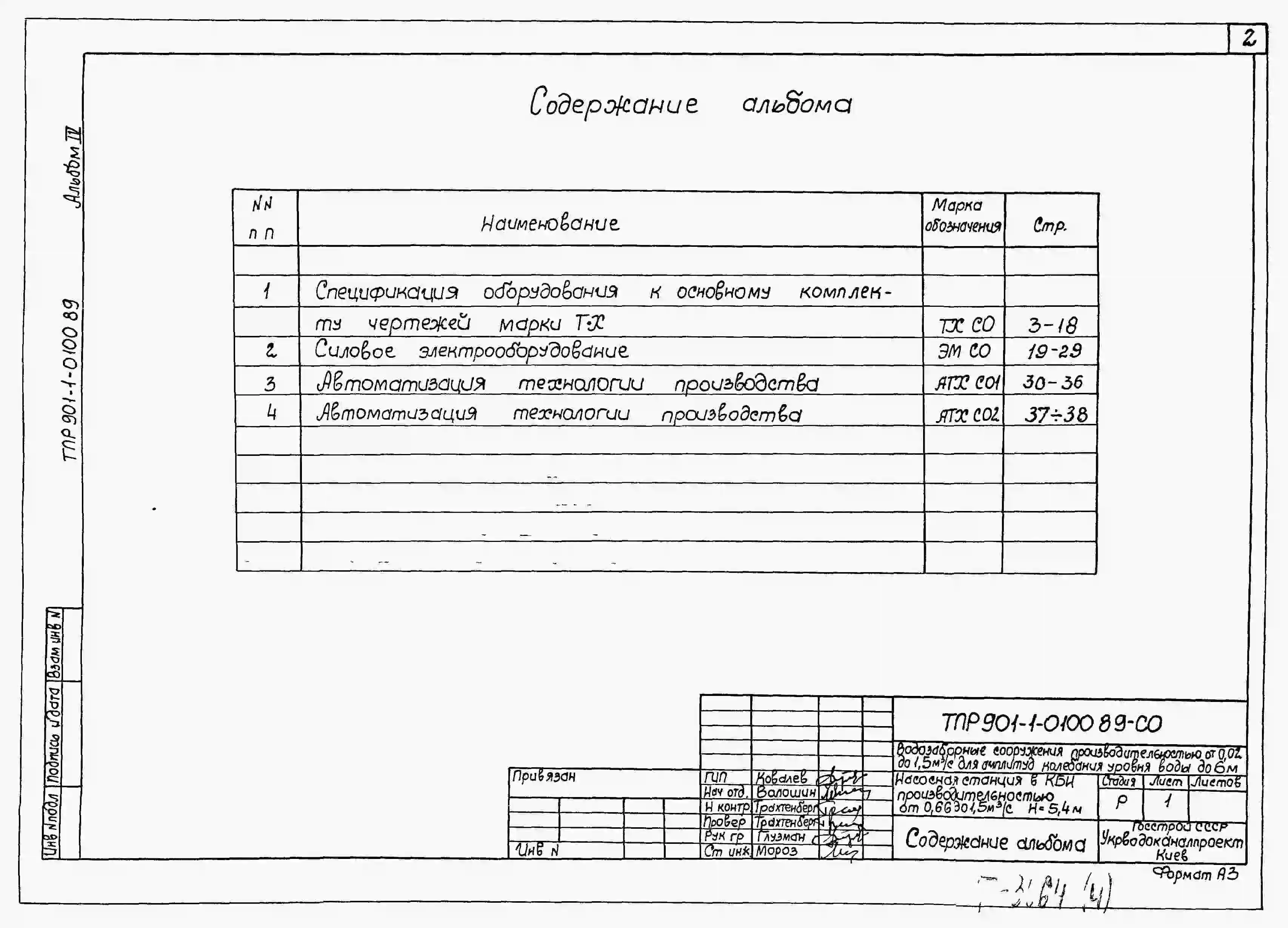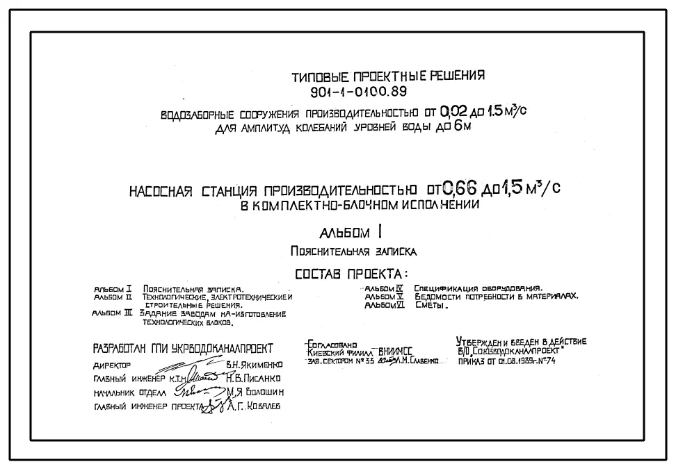 Типовой проект 901-1-0100.89 Насосная станция производительностью от 0,66 до 1,5 м.куб/сек вкомплектно-блочном исполнении для водозаборных сооружений производительностью от 0,02 до 1,5 м.куб/с ,для амплитуд колебаний уровней воды до 6 м