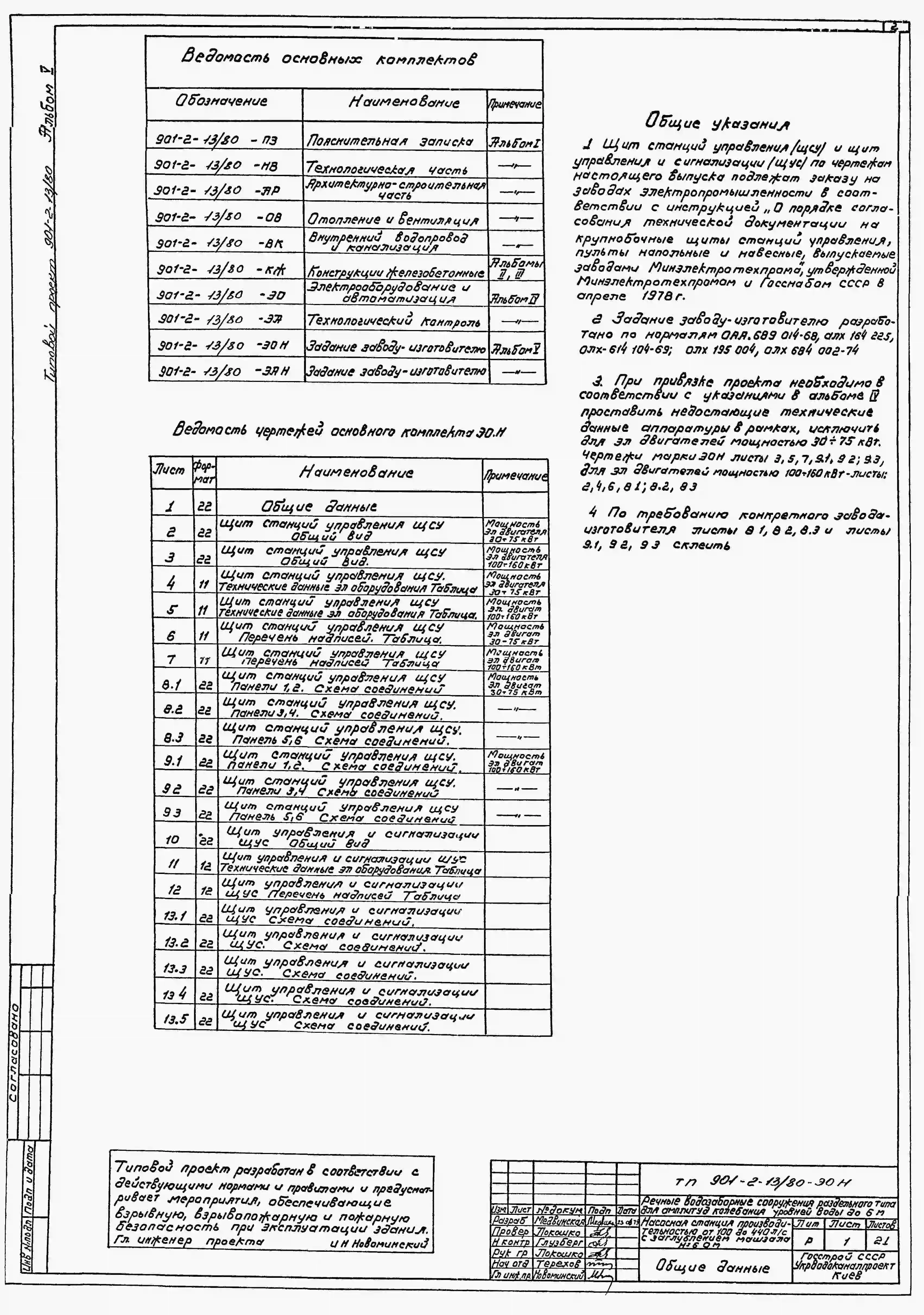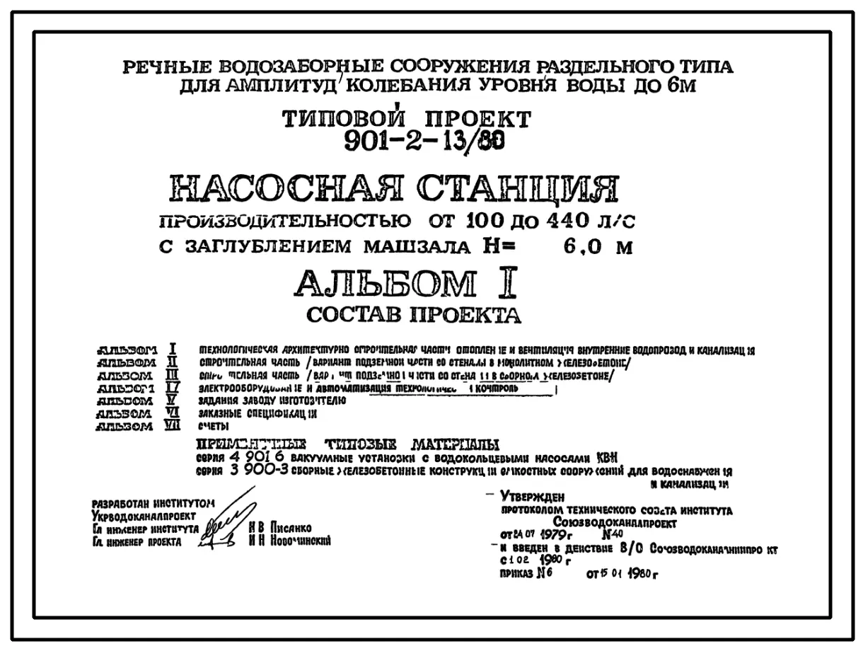 Типовой проект 901-2-13/80 Насосная станция производительностью от 100 до 440 л/с с заглублением машзала 6 м (для водозаборных сооружений раздельного типа для амплитуд колебаний уровней воды до 6 м)