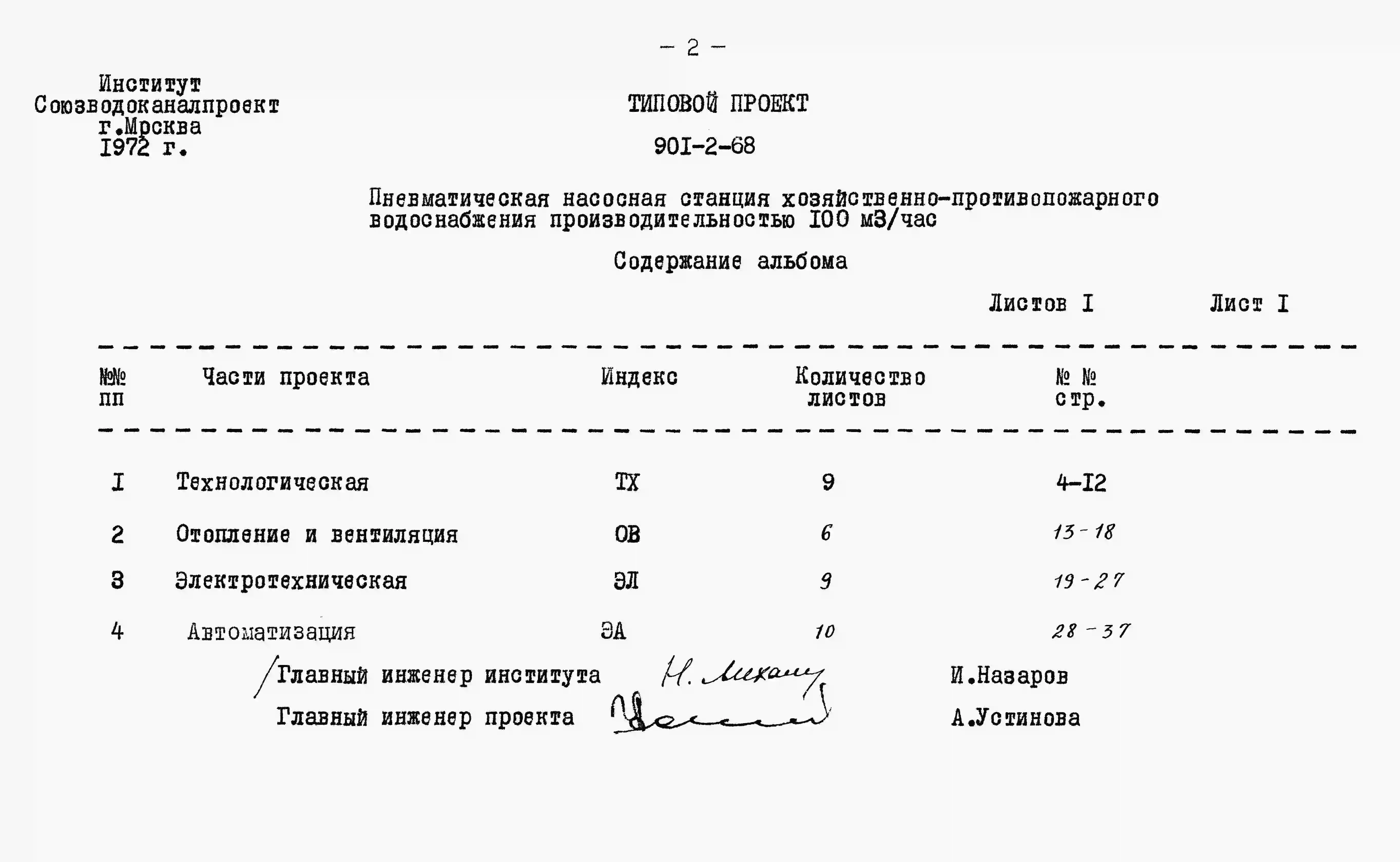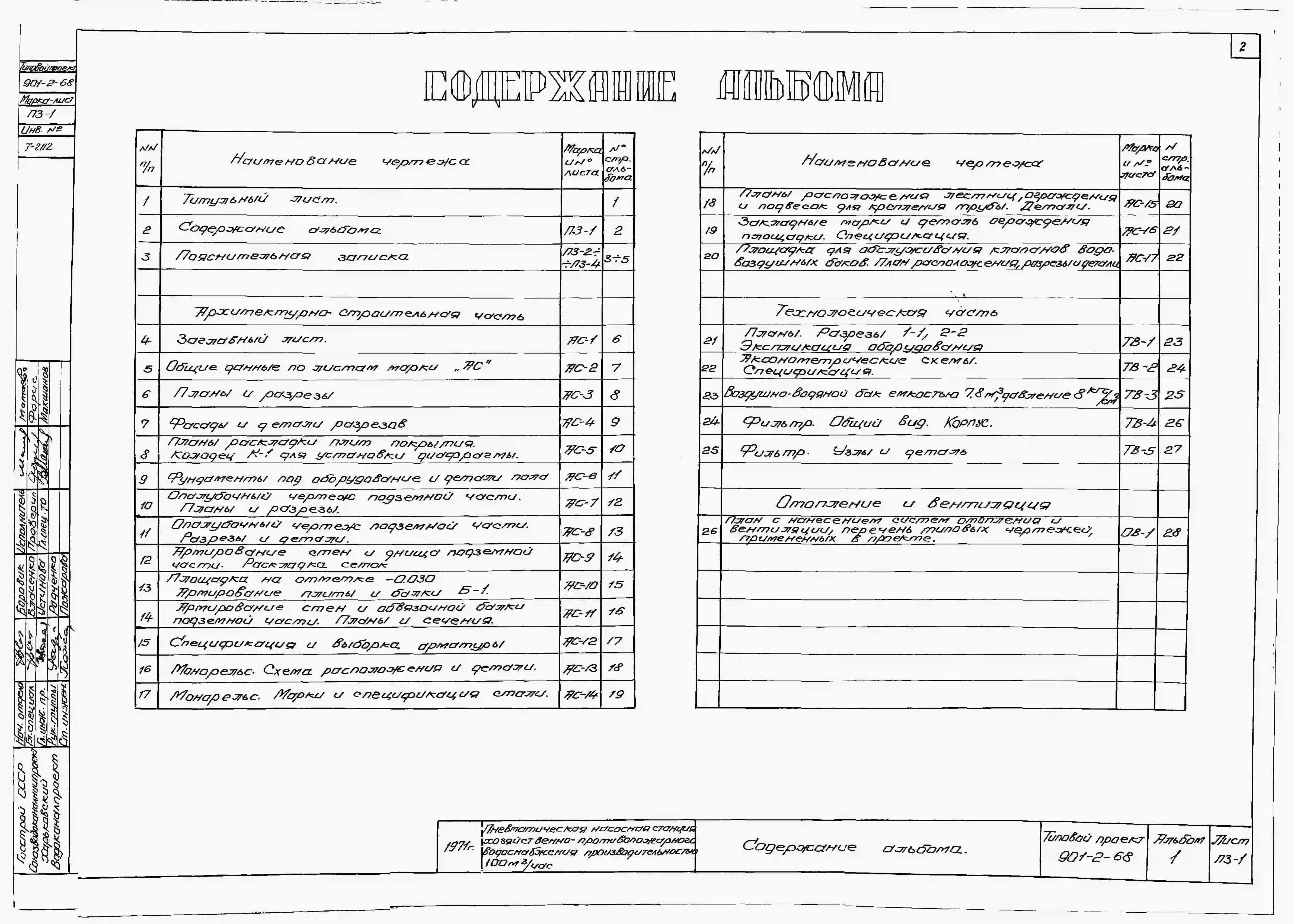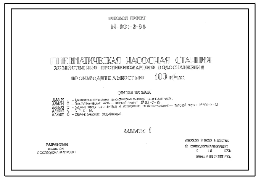 Типовой проект 901-2-68 Пневматическая насосная станция хозяйственно-противопожарного водоснабжения производительностью 100 м.куб/час