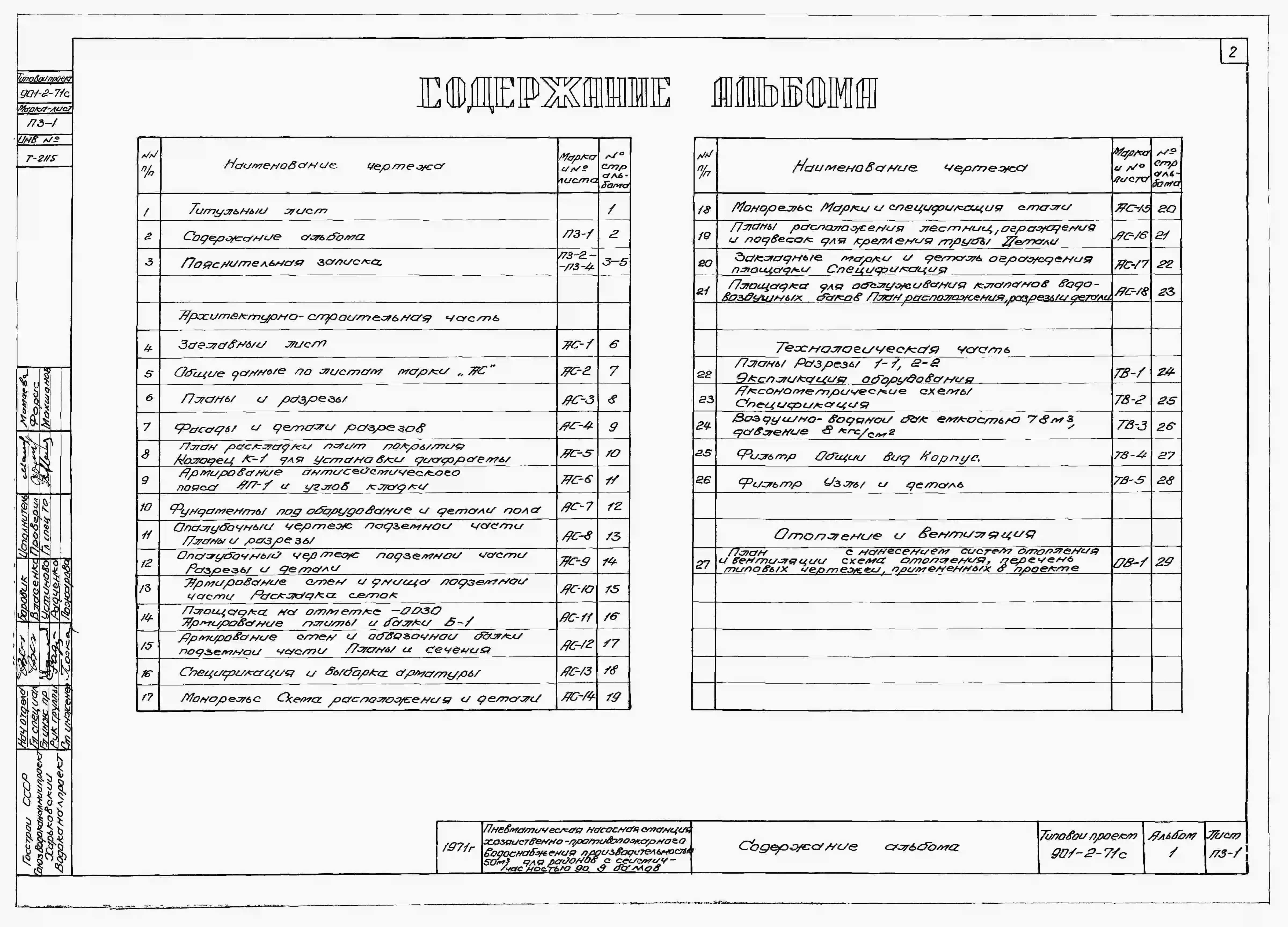 Типовой проект 901-2-71с Пневматическая насосная станция хозяйственно-противопожарного водоснабжения производительностью 100 м3/час для районов с сейсмичностью до 9 баллов