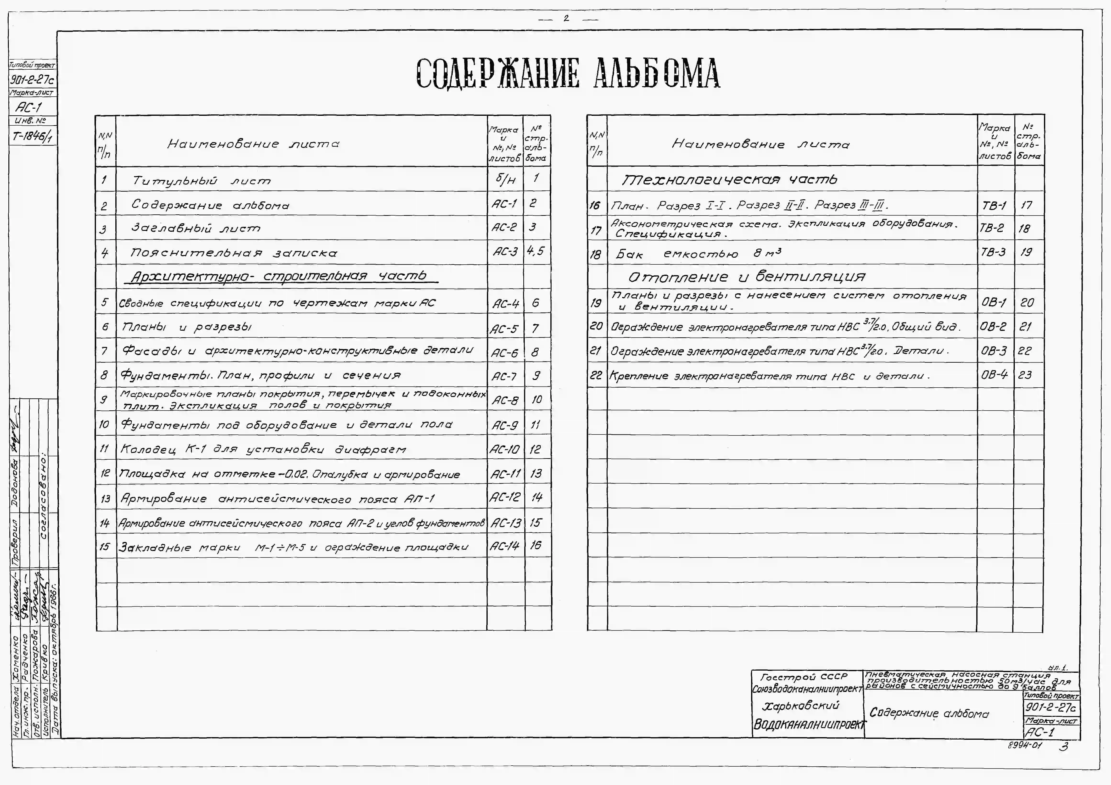 Типовой проект 901-2-27с Пневматическая насосная станция производительностью 50 м3/час